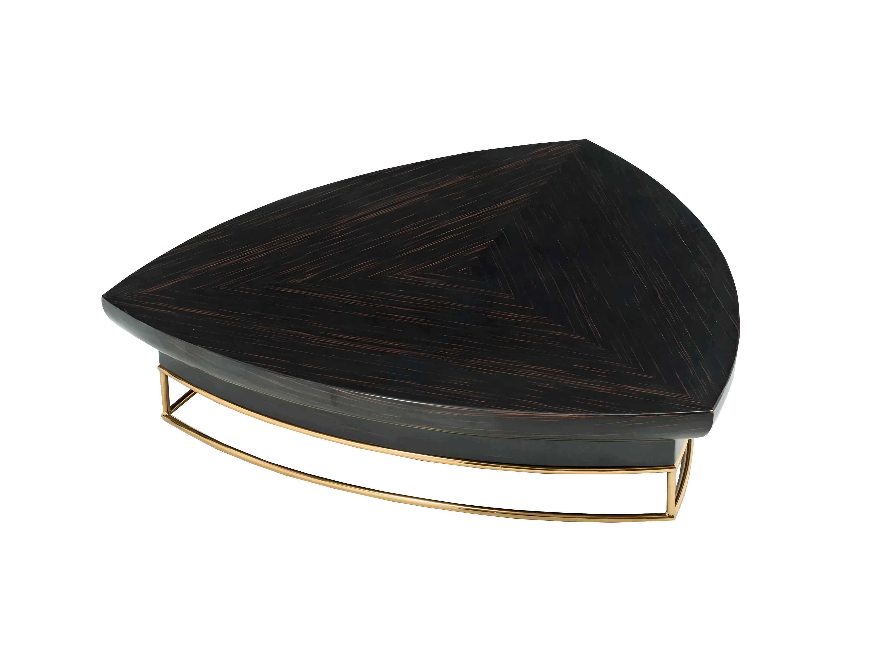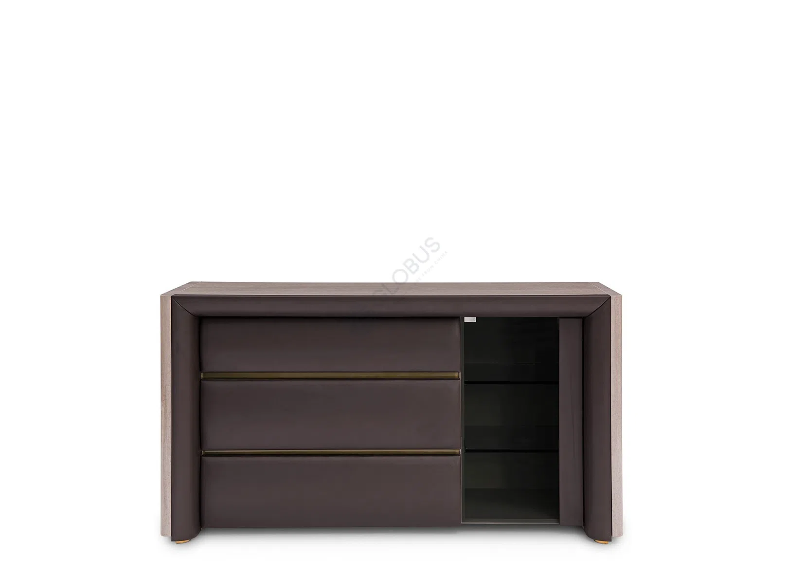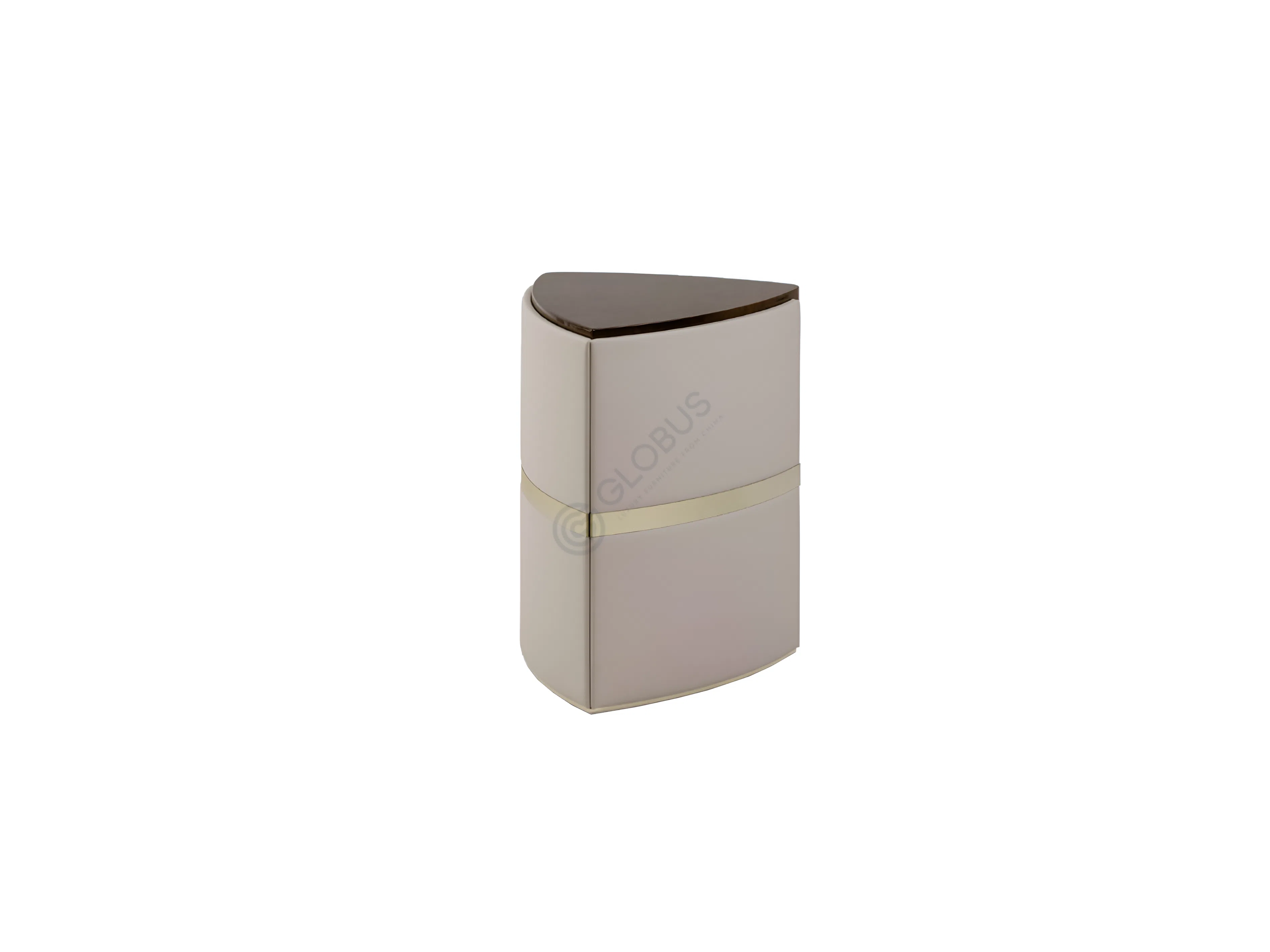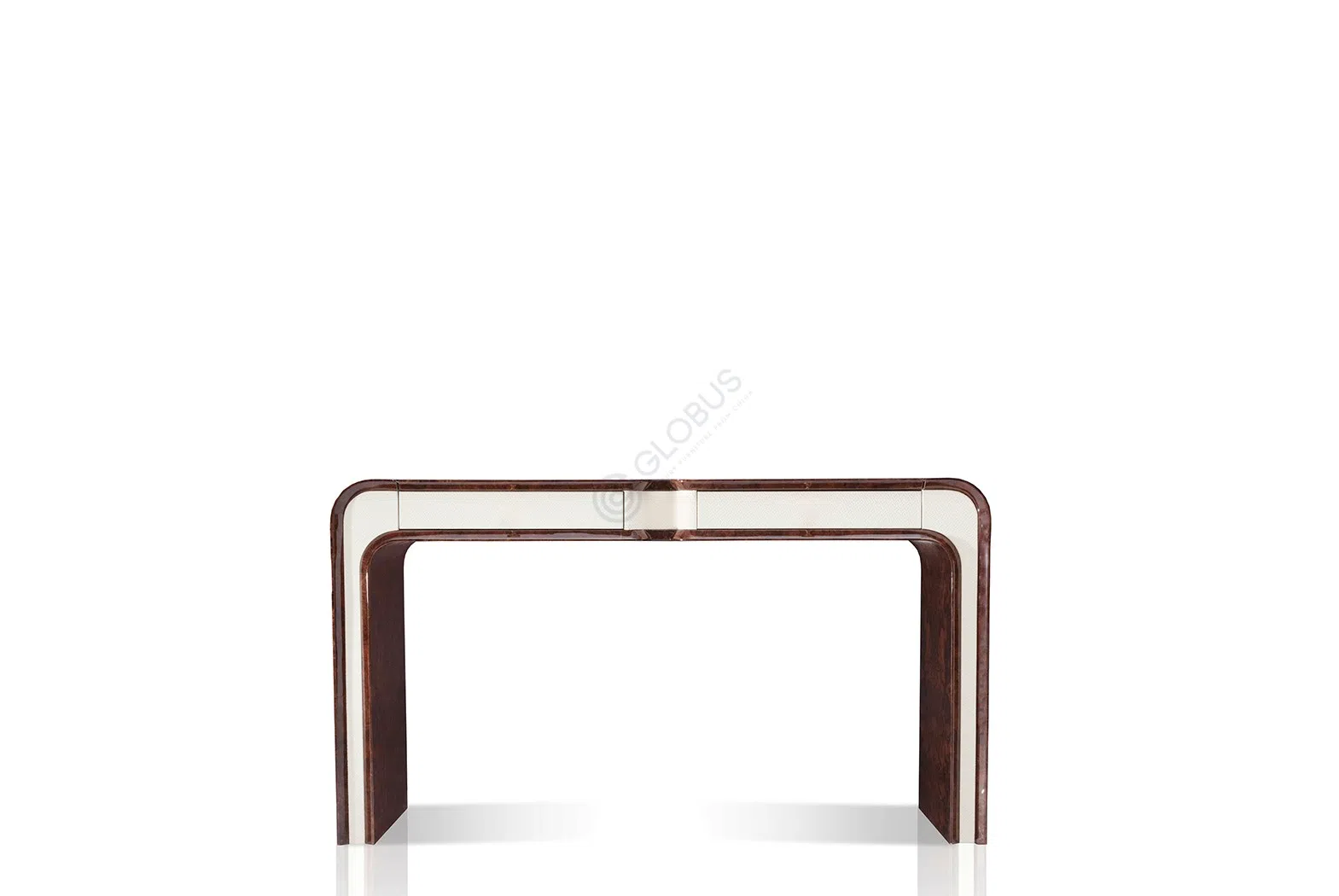 Конструкция столика базируется на прочной фанере, облицованной высококачественным шпоном, что придает изделию богатый древесный оттенок и природную текстуру. Эта основа дополняется искусно интегрированными элементами из нержавеющей стали, которые подчеркивают геометрию и добавляют деликатный блеск. Внутренние поверхности и изогнутая центральная панель обтянуты нежной экокожей на микрофибре, создавая приятную на ощупь поверхность и визуальный контраст.