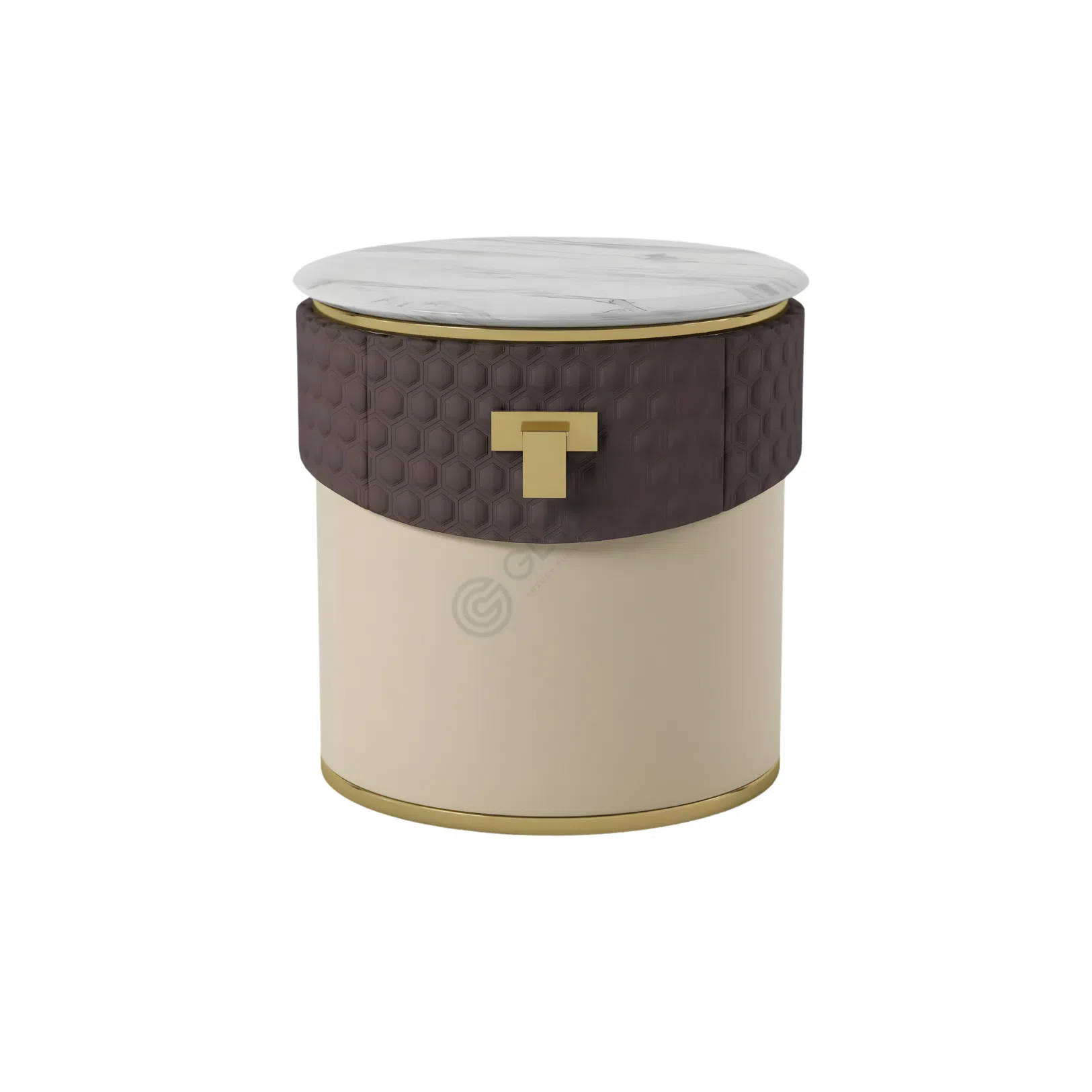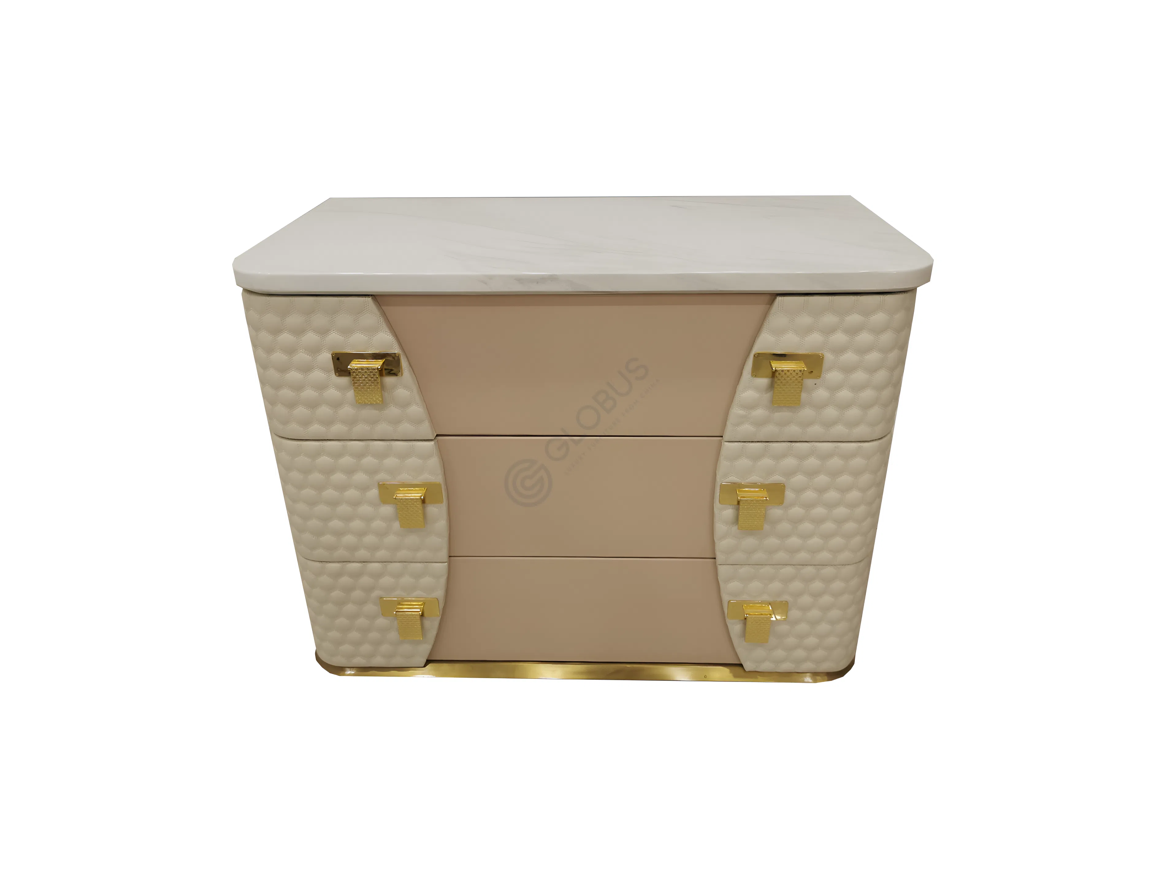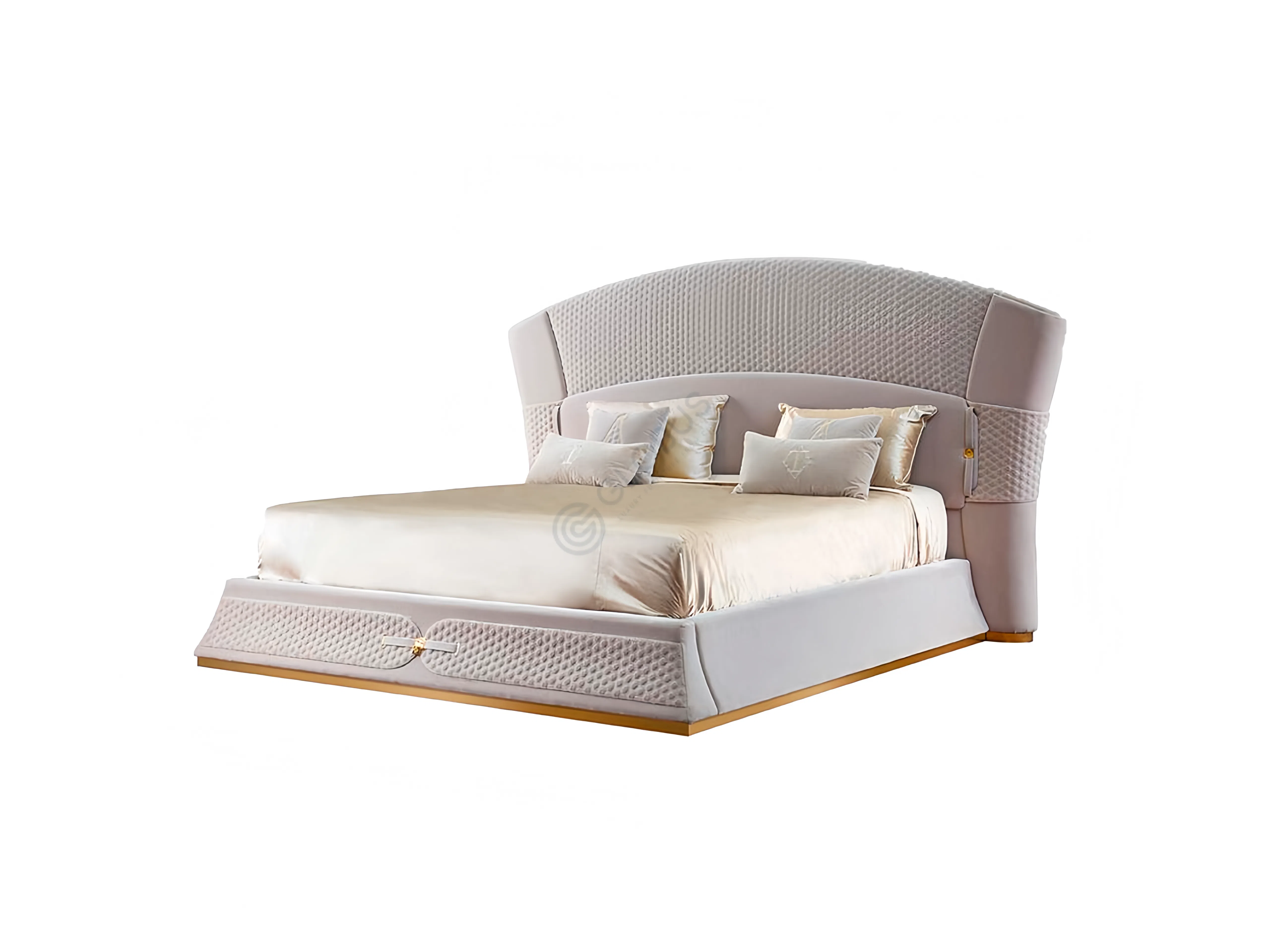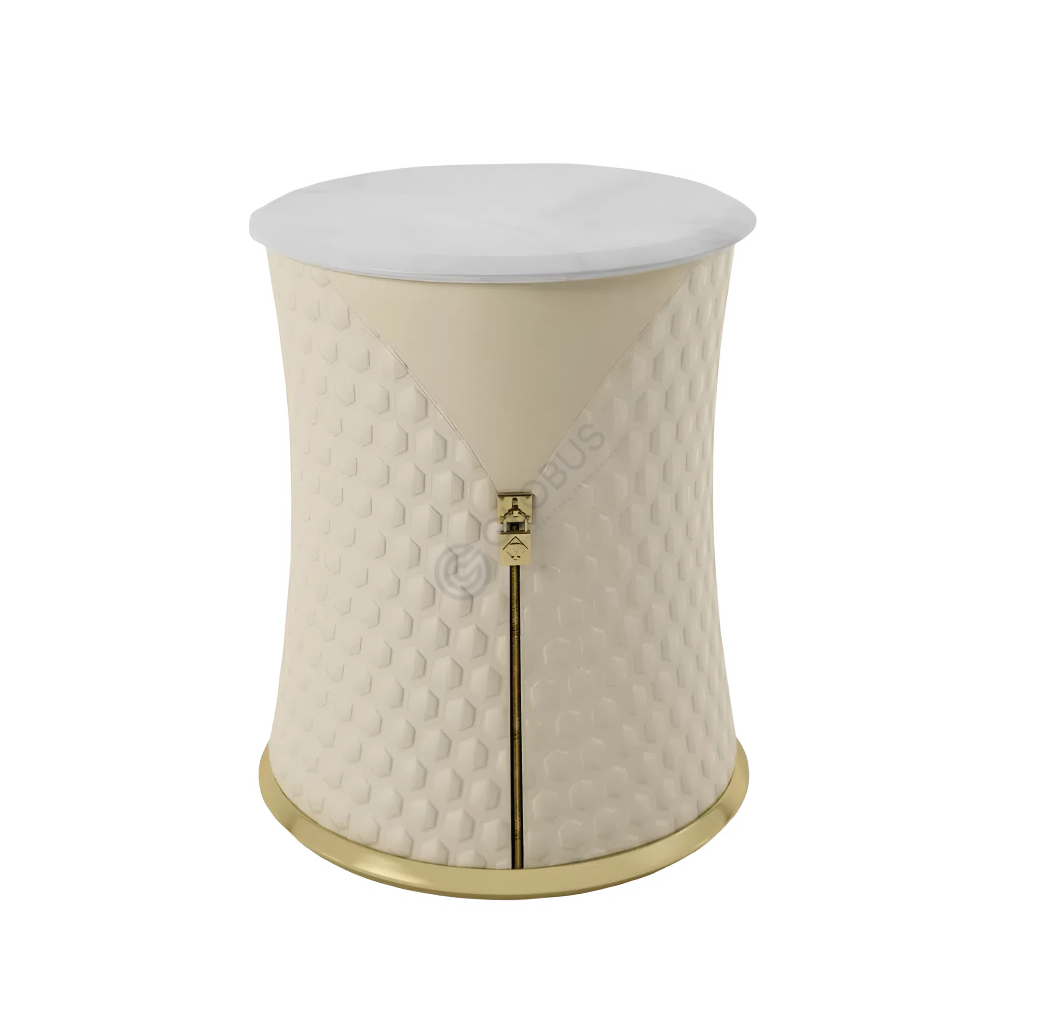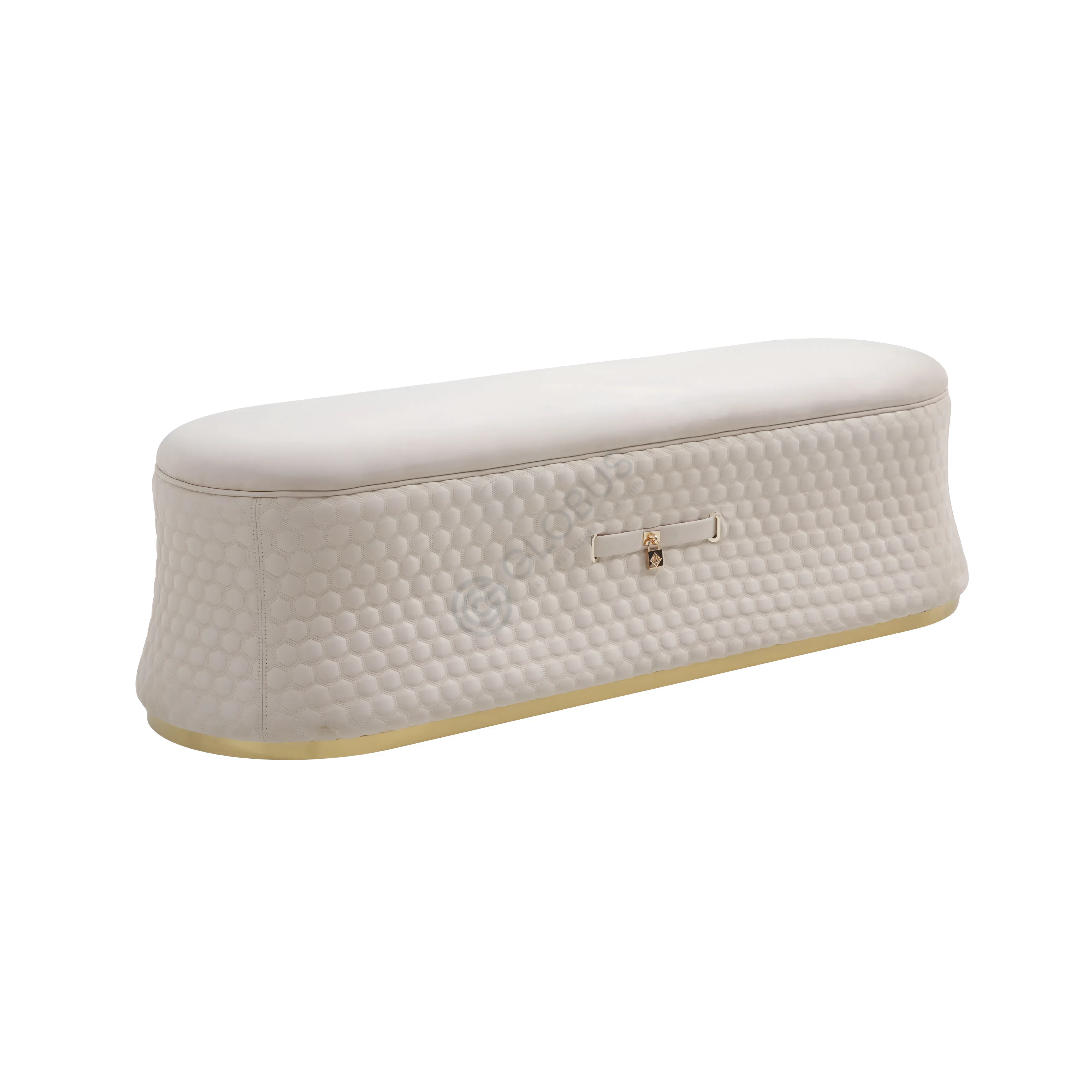 Обивка из мягкого текстиля, выполненная в светлом оттенке, тактильно приятна и дополнена искусной шестиугольной стежкой, придающей фактурную глубину и визуальный интерес. Прочное основание из натурального дерева обеспечивает надежность конструкции, в то время как мерцающая полоса из нержавеющей стали с золотистым покрытием изящно опоясывает нижнюю часть, добавляя предмету роскошный и завершенный вид.