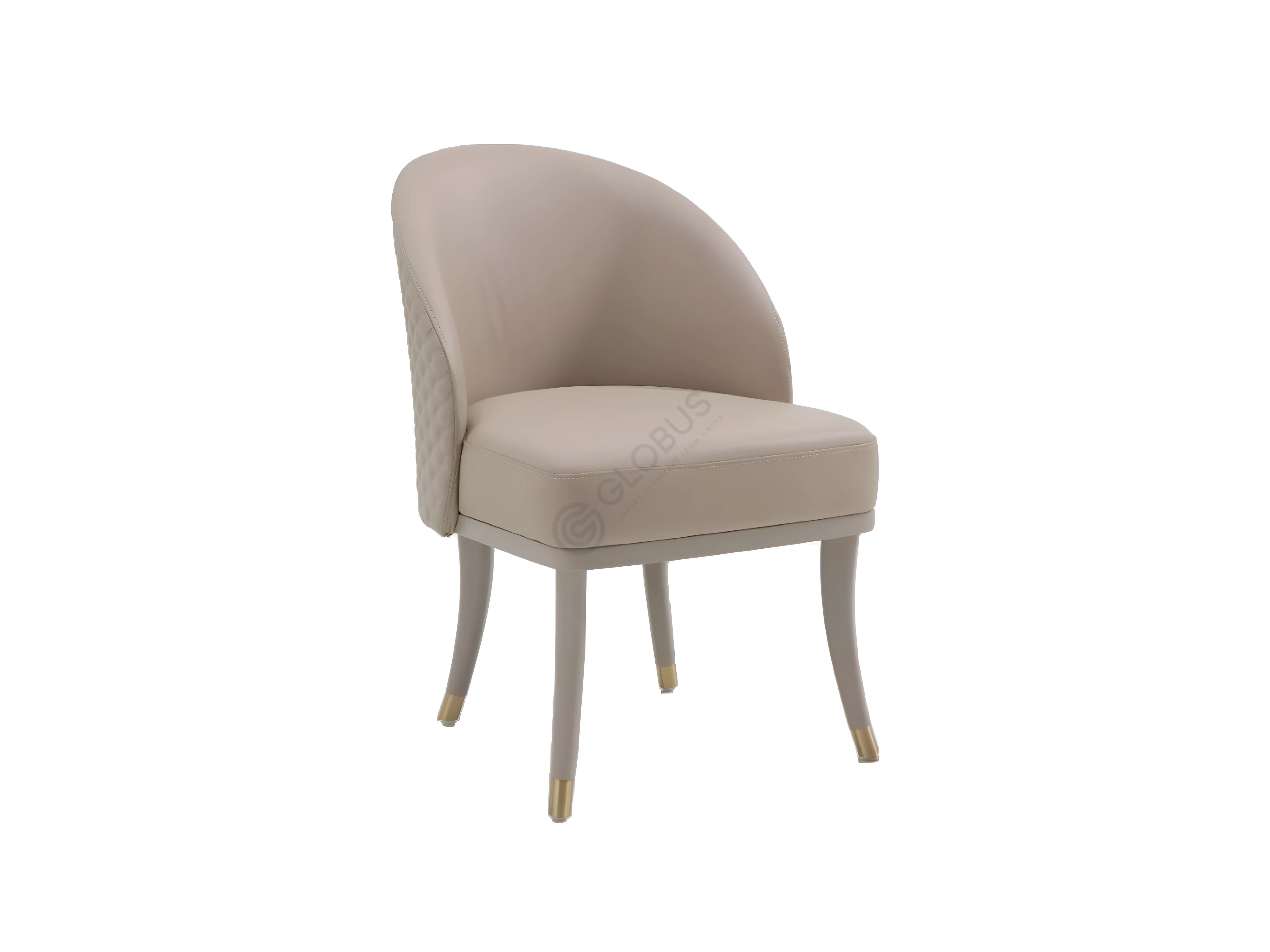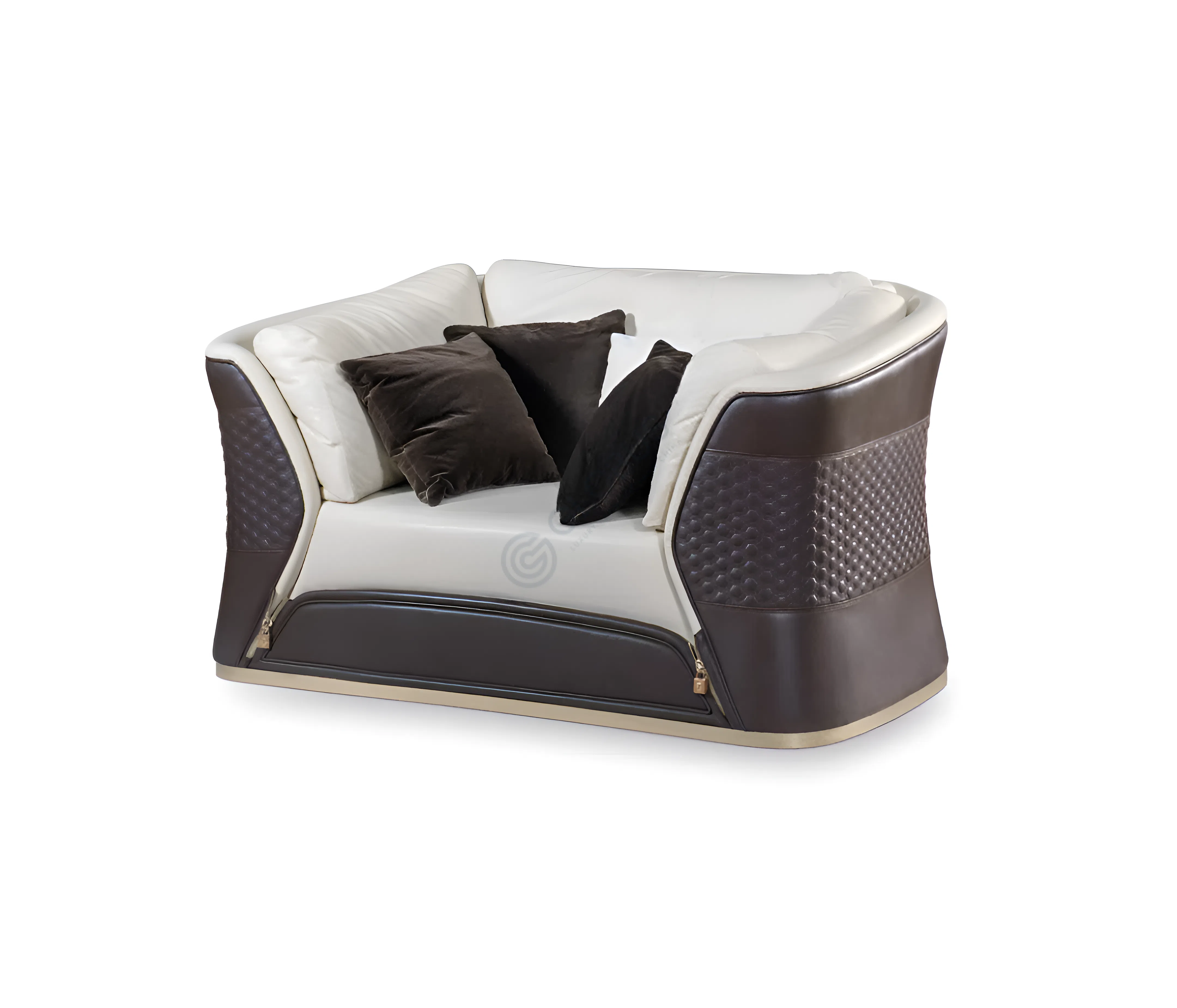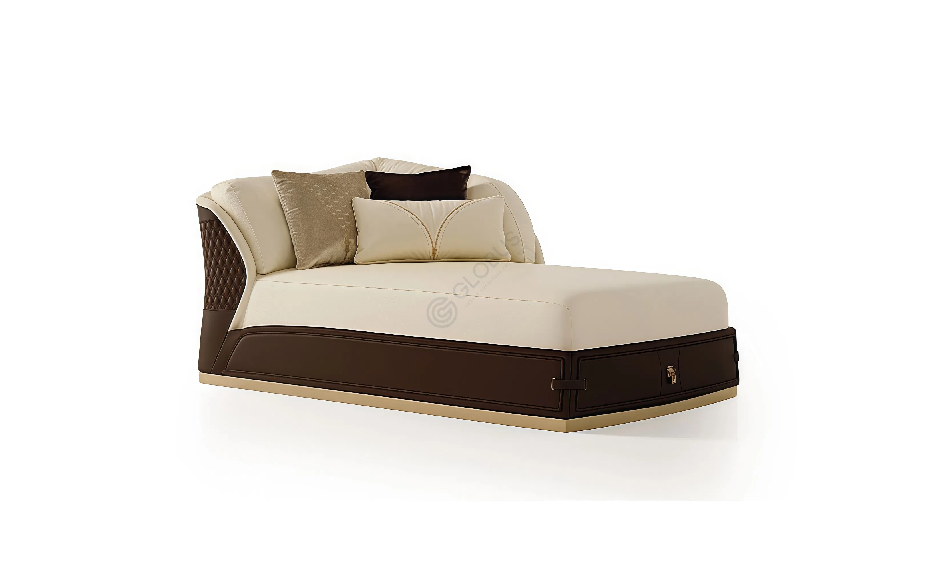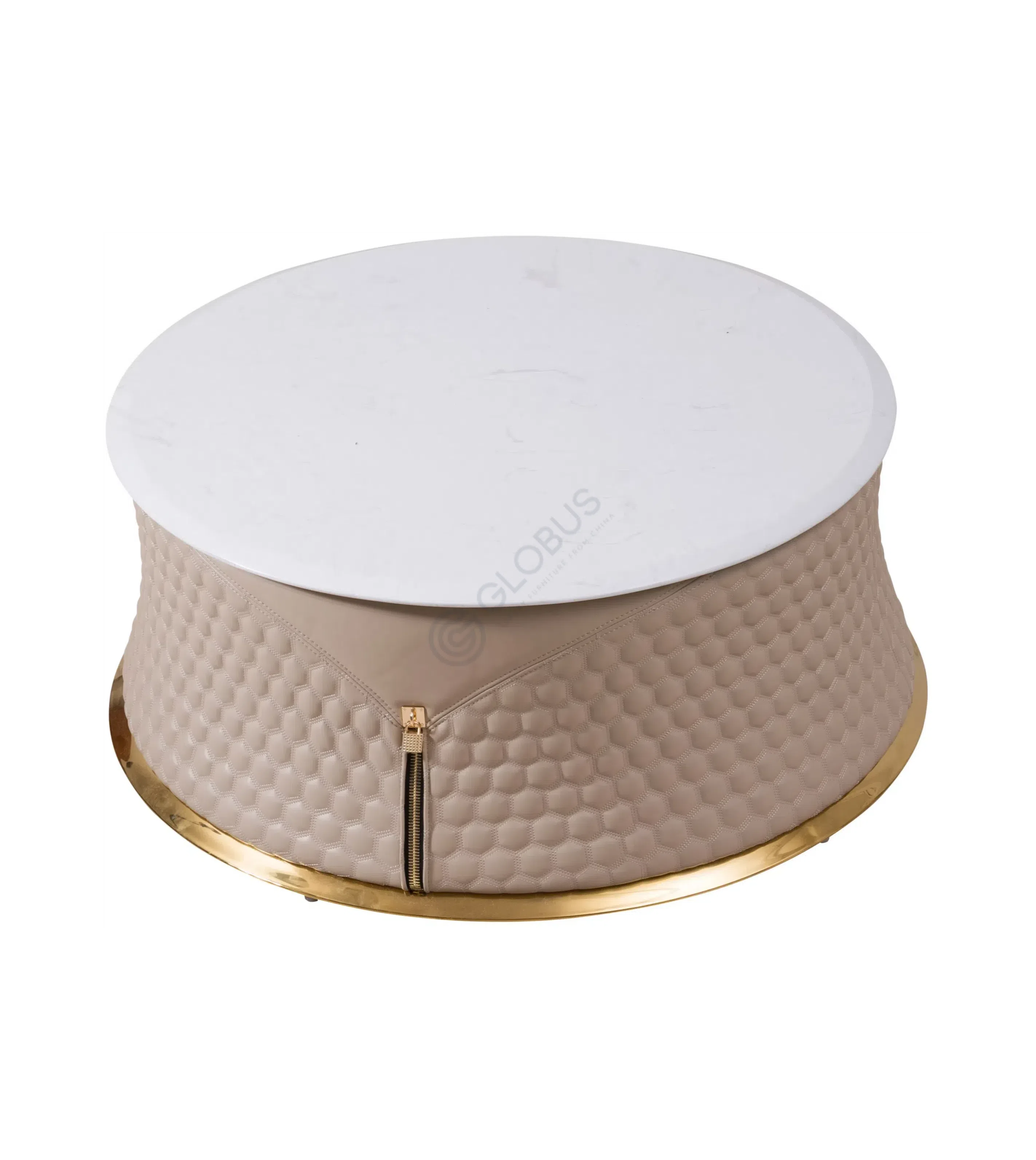 Обивка из мягкого текстиля, выполненная в светлом оттенке, тактильно приятна и дополнена искусной шестиугольной стежкой, придающей фактурную глубину и визуальный интерес. Прочное основание из натурального дерева обеспечивает надежность конструкции, в то время как мерцающая полоса из нержавеющей стали с золотистым покрытием изящно опоясывает нижнюю часть, добавляя предмету роскошный и завершенный вид.