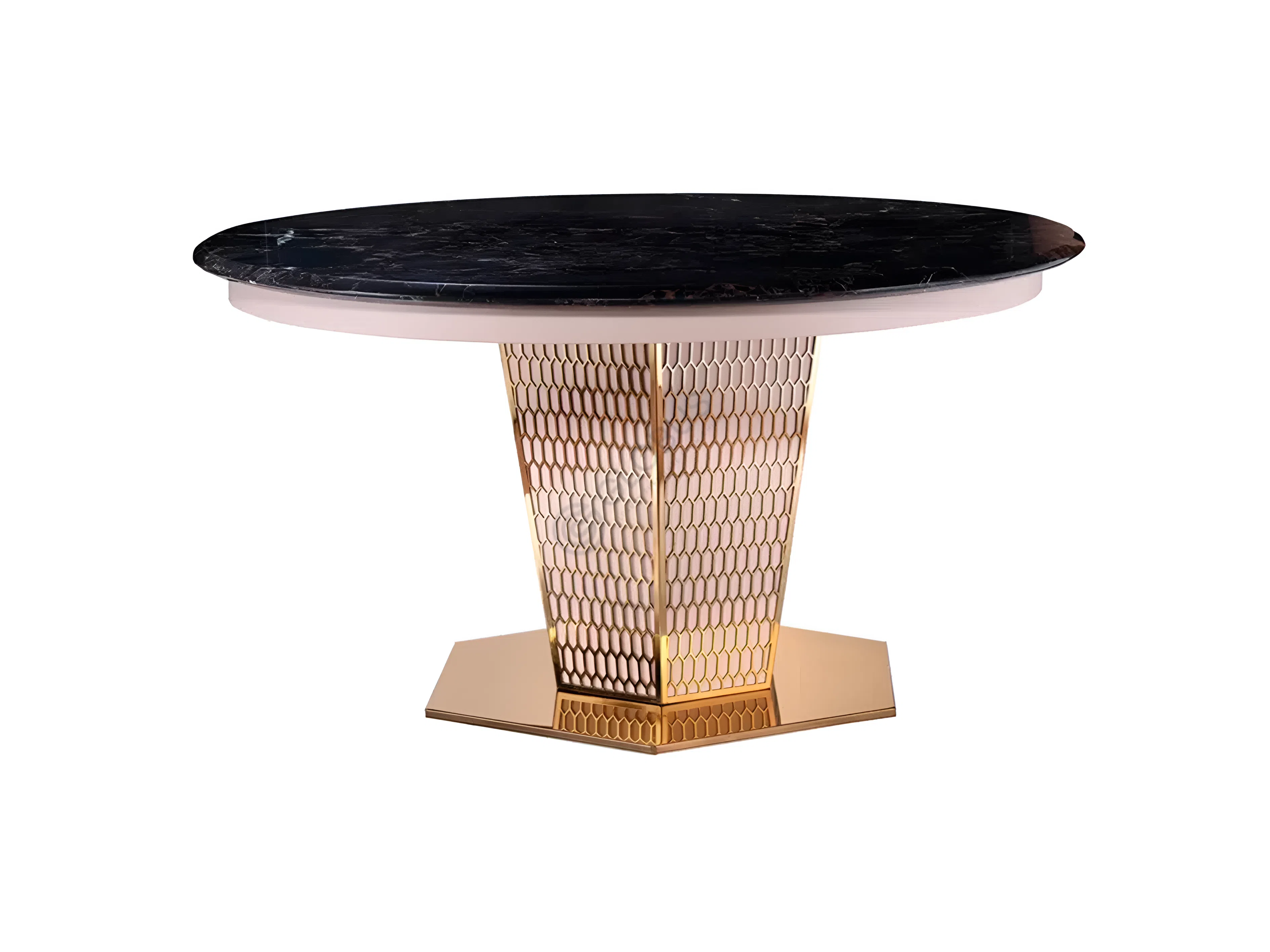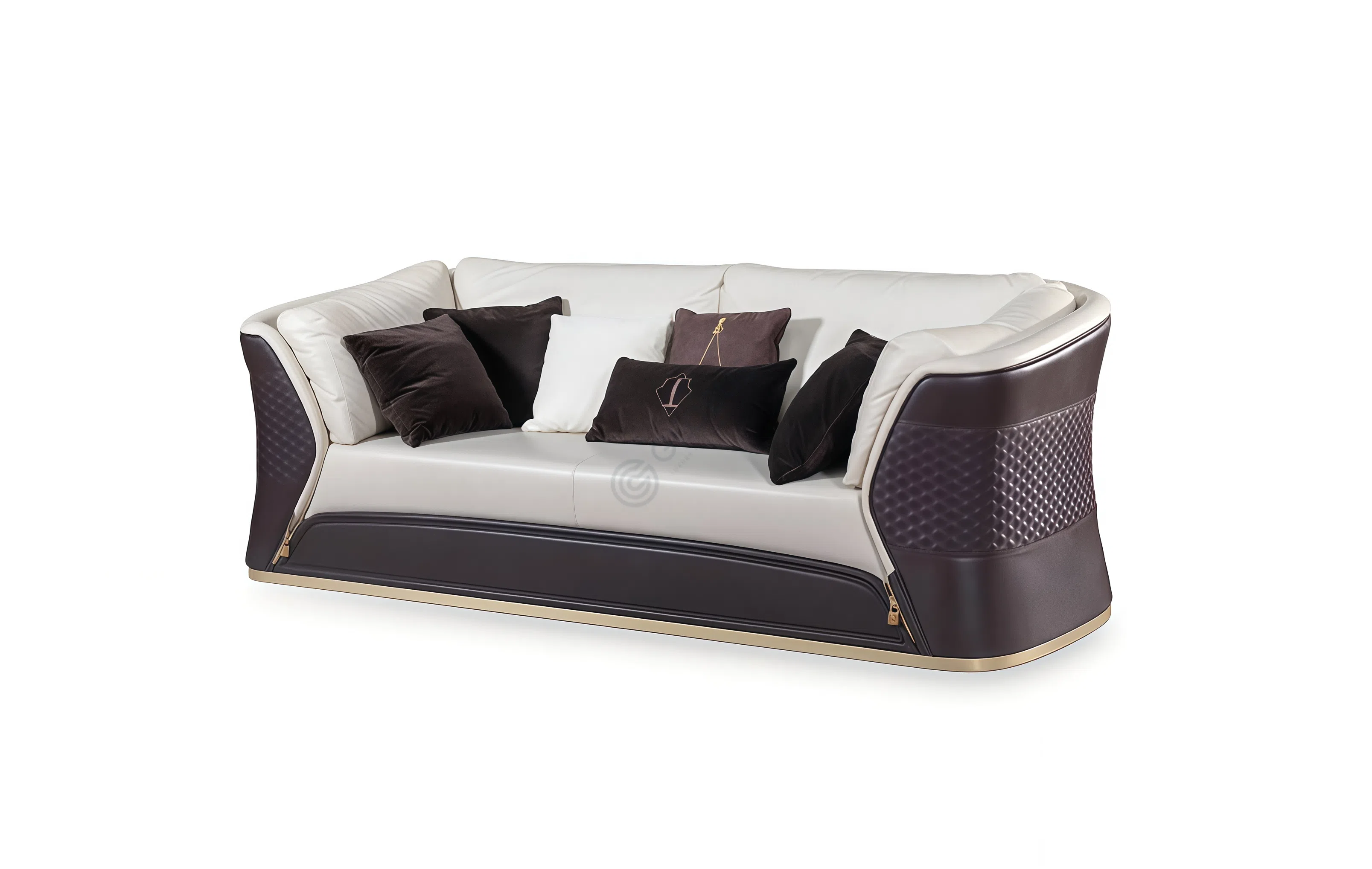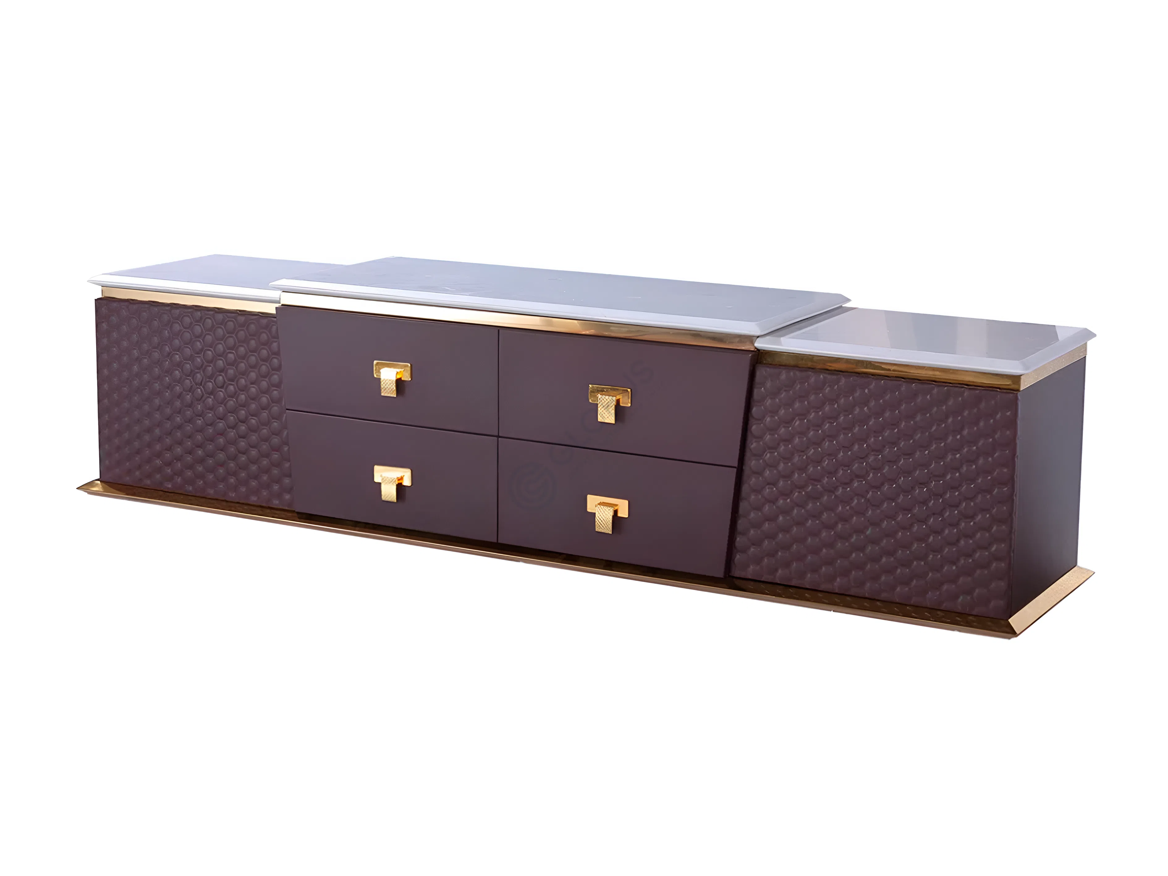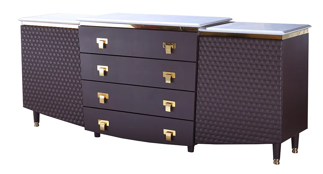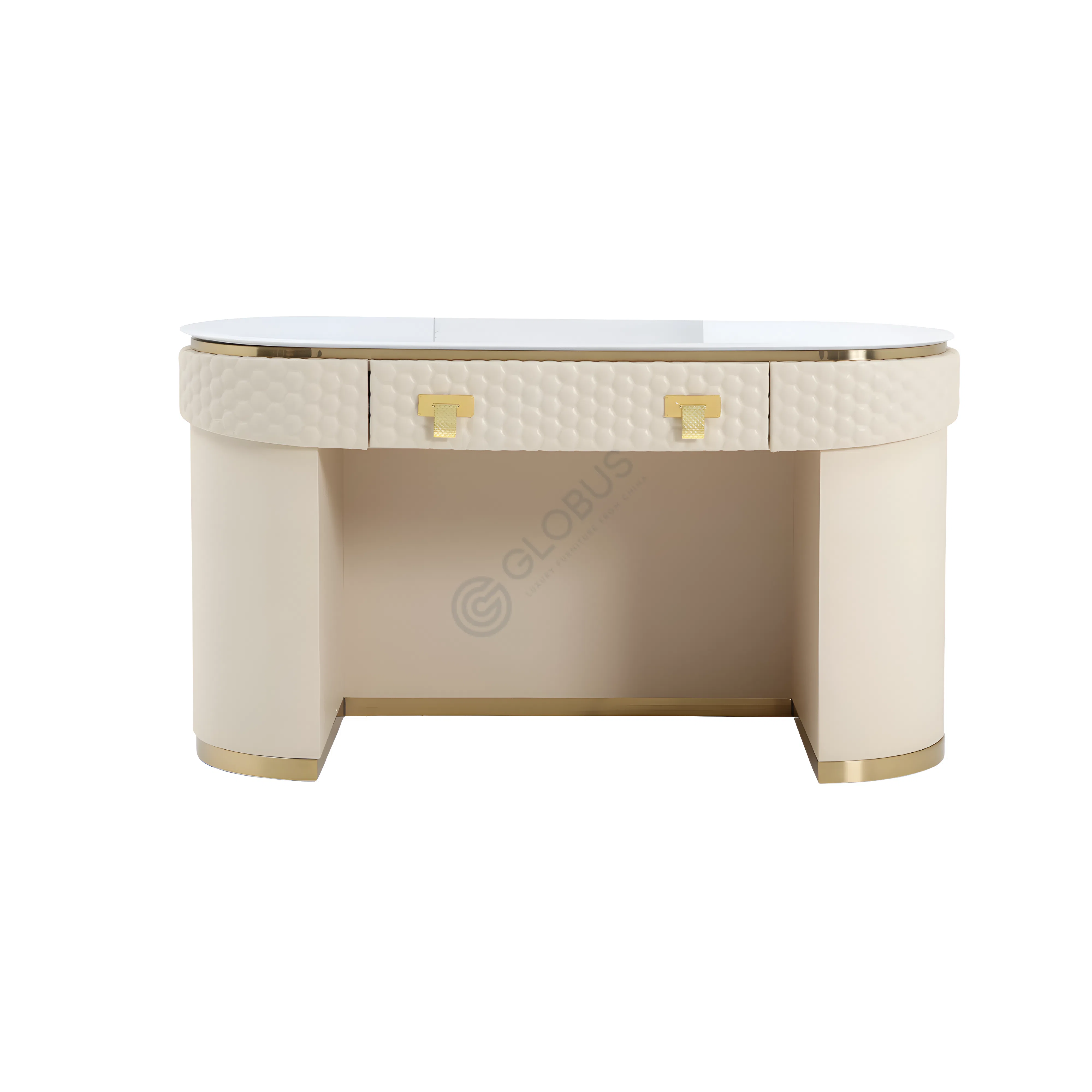 Обивка из мягкого текстиля, выполненная в светлом оттенке, тактильно приятна и дополнена искусной шестиугольной стежкой, придающей фактурную глубину и визуальный интерес. Прочное основание из натурального дерева обеспечивает надежность конструкции, в то время как мерцающая полоса из нержавеющей стали с золотистым покрытием изящно опоясывает нижнюю часть, добавляя предмету роскошный и завершенный вид.