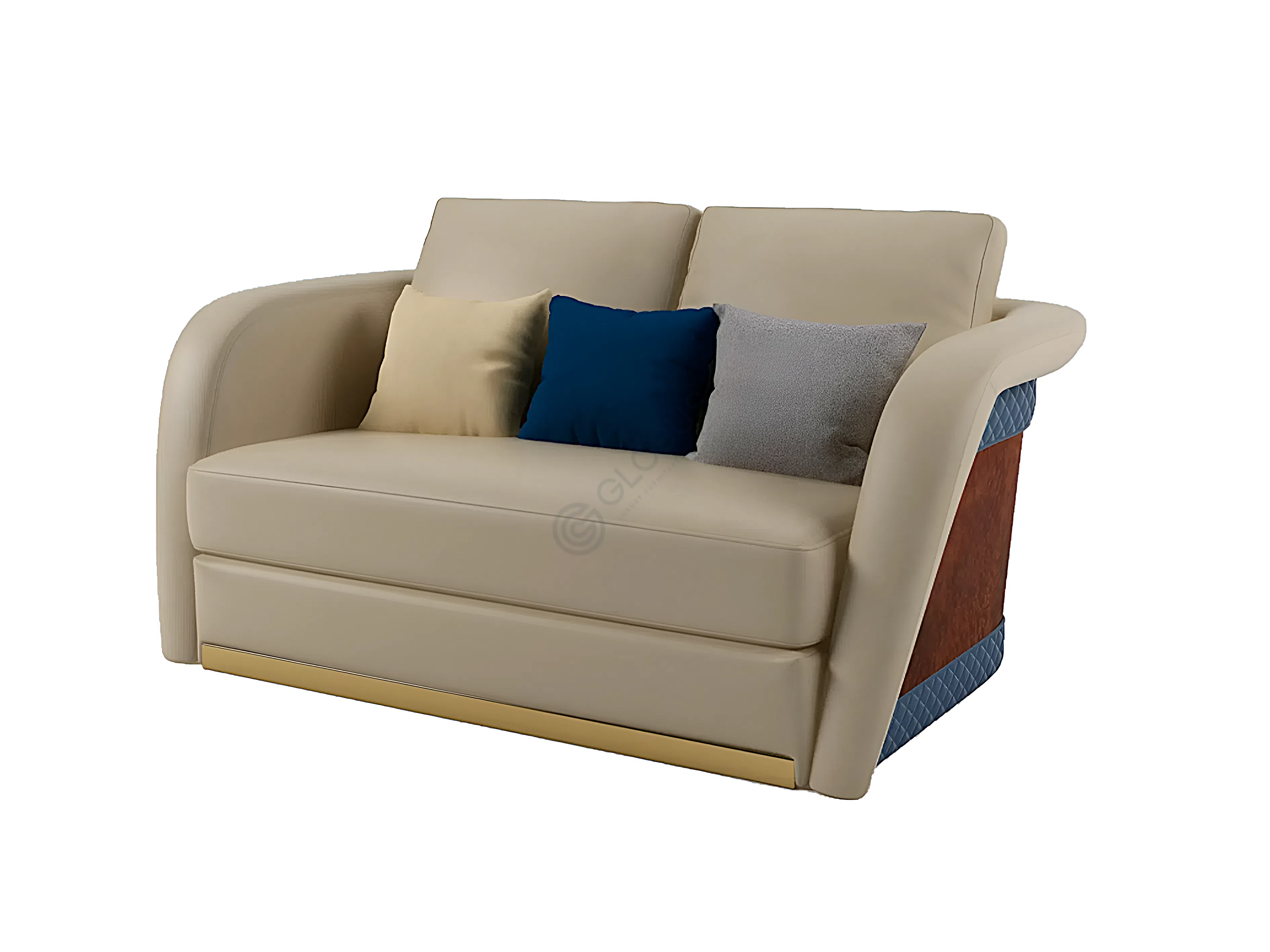 Обивка из высококачественного текстиля нежного оттенка придает изделию благородный и тактильно приятный вид. Особое внимание привлекают боковые панели, где богатая текстура натурального дерева искусно сочетается с акцентами из синего текстиля, украшенного деликатной стежкой. Этот выразительный контраст материалов подчеркнут элегантной вставкой из нержавеющей стали у основания, добавляющей нотку современного шика. Внутренняя структура, выполненная из прочной фанеры, обеспечивает надежность и долговечность конструкции.
