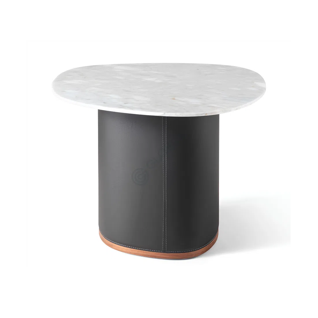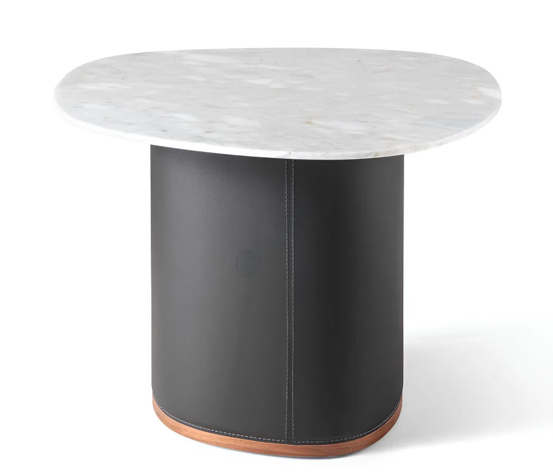 Гладкое основание, обтянутое кожей с аккуратной декоративной строчкой, гармонично дополняет элегантную столешницу. Теплый оттенок шпона у основания вносит нотку домашнего уюта и завершает образ этого функционального акцента для гостиной.