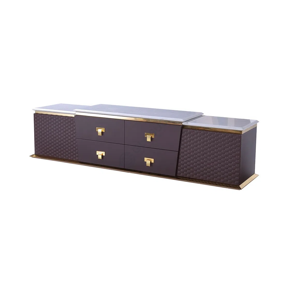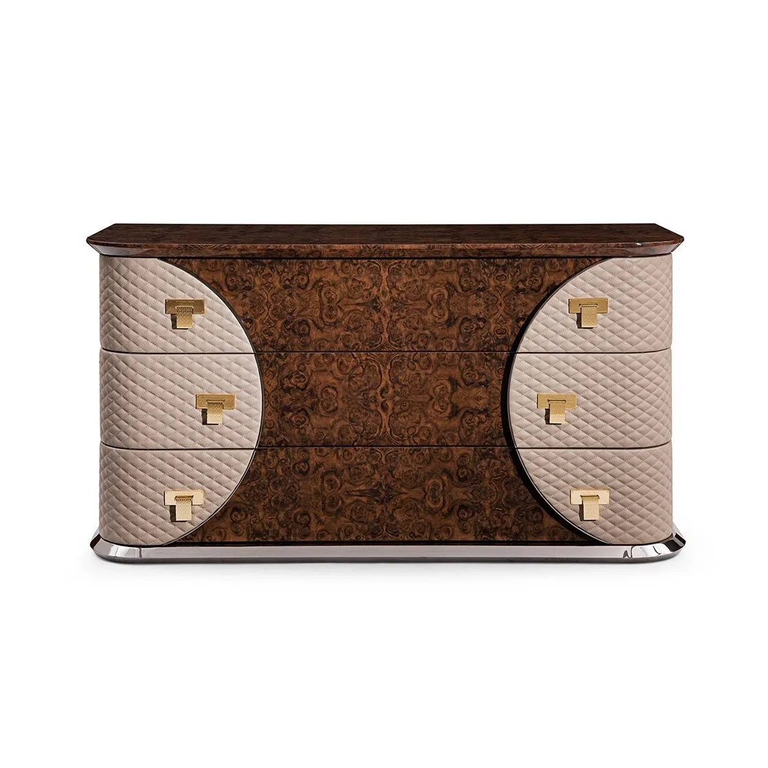 Плавные линии дверей, облицованные шпоном натурального дерева, создают выразительный акцент, открывая взору внутреннее наполнение. Ручки и тонкое основание из нержавеющей стали добавляют конструкции прочности и изысканного блеска, являясь элегантными деталями в общем ансамбле.