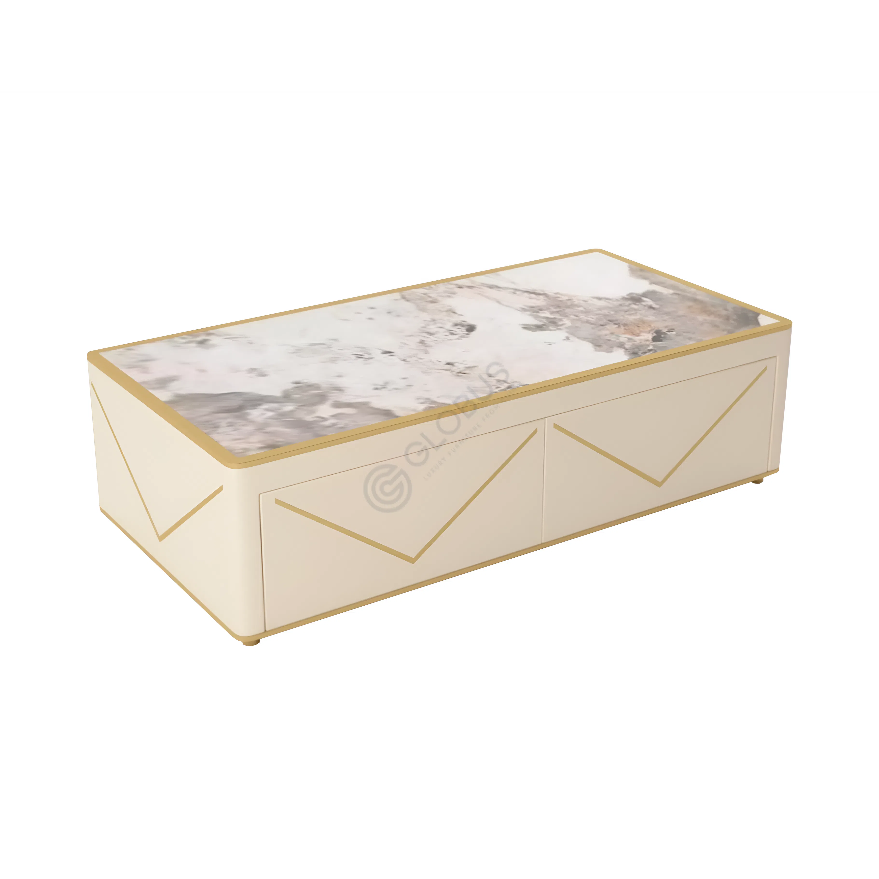 Столешница выполнена из спеченного камня, рисунок которого напоминает благородный мрамор, привнося в изделие неповторимый характер и прочность. Ее края аккуратно обрамлены полированной нержавеющей сталью теплого золотистого оттенка, что придает столику дополнительную глубину и роскошное сияние.
