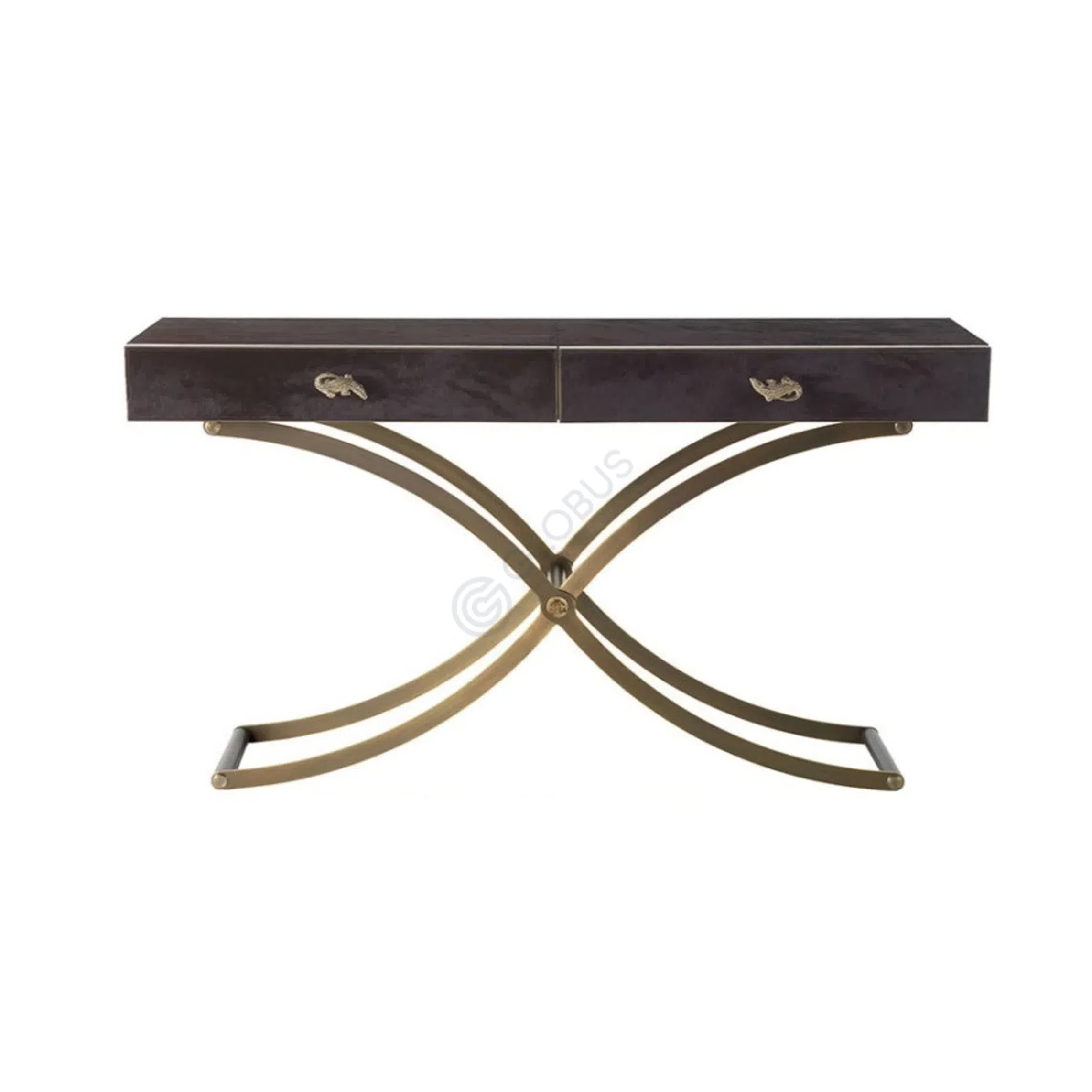 Основание столика является произведением инженерного и художественного мастерства. Его опорные элементы, изготовленные из безупречной нержавеющей стали, образуют изящный перекрестный узор, который придает конструкции как визуальную легкость, так и исключительную устойчивость. Блеск металла идеально контрастирует с мягкостью замши, подчеркивая каждый использованный материал.