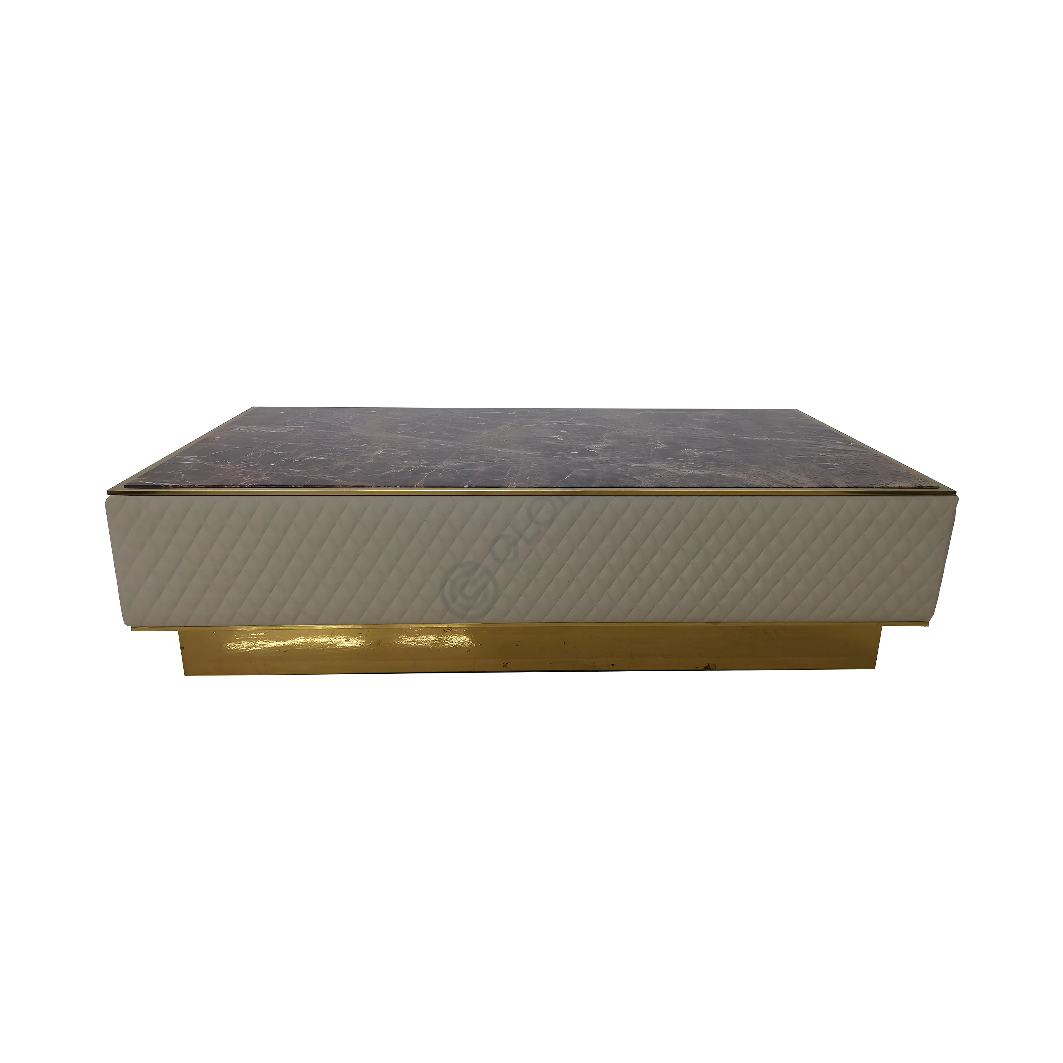 Вершина столика украшена плитой из натурального мрамора, чьи уникальные узоры и глубокие оттенки придают поверхности неповторимый шарм. Благородный камень обрамляет тонкая полоса из нержавеющей стали с деликатным золотистым отливом, добавляя структуре изысканности. Основной корпус обит высококачественным текстилем светлого оттенка, с изящной ромбовидной стежкой, что придает объем и мягкость, создавая тактильно приятный вид. Внутренняя структура, выполненная из прочной фанеры, обеспечивает устойчивость и долговечность.