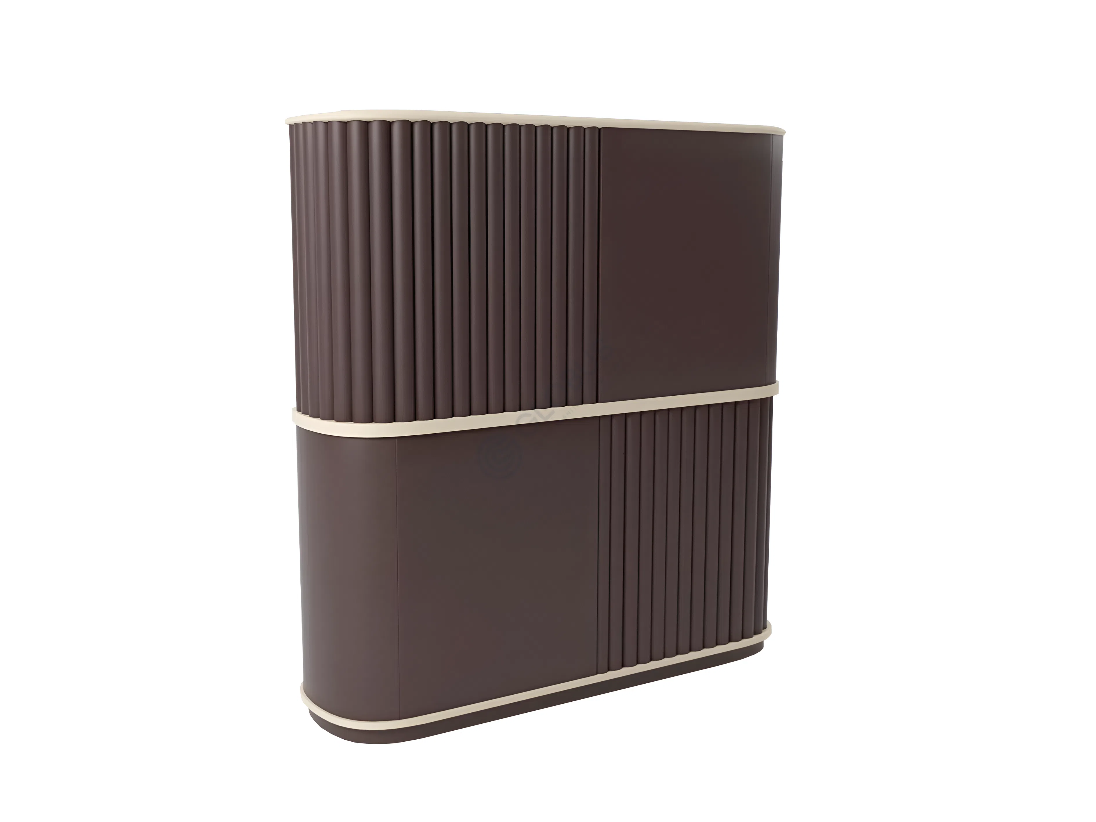 Основой изделия служит прочная фанера, обеспечивающая надёжность и долговечность конструкции. Фасад искусно обтянут экокожей на микрофибре, придавая тумбе мягкость и глубокий матовый оттенок, который приятно ощущается на ощупь. Ребристая фактура по бокам создаёт динамичный визуальный эффект, контрастируя с гладкими поверхностями центральных выдвижных секций.