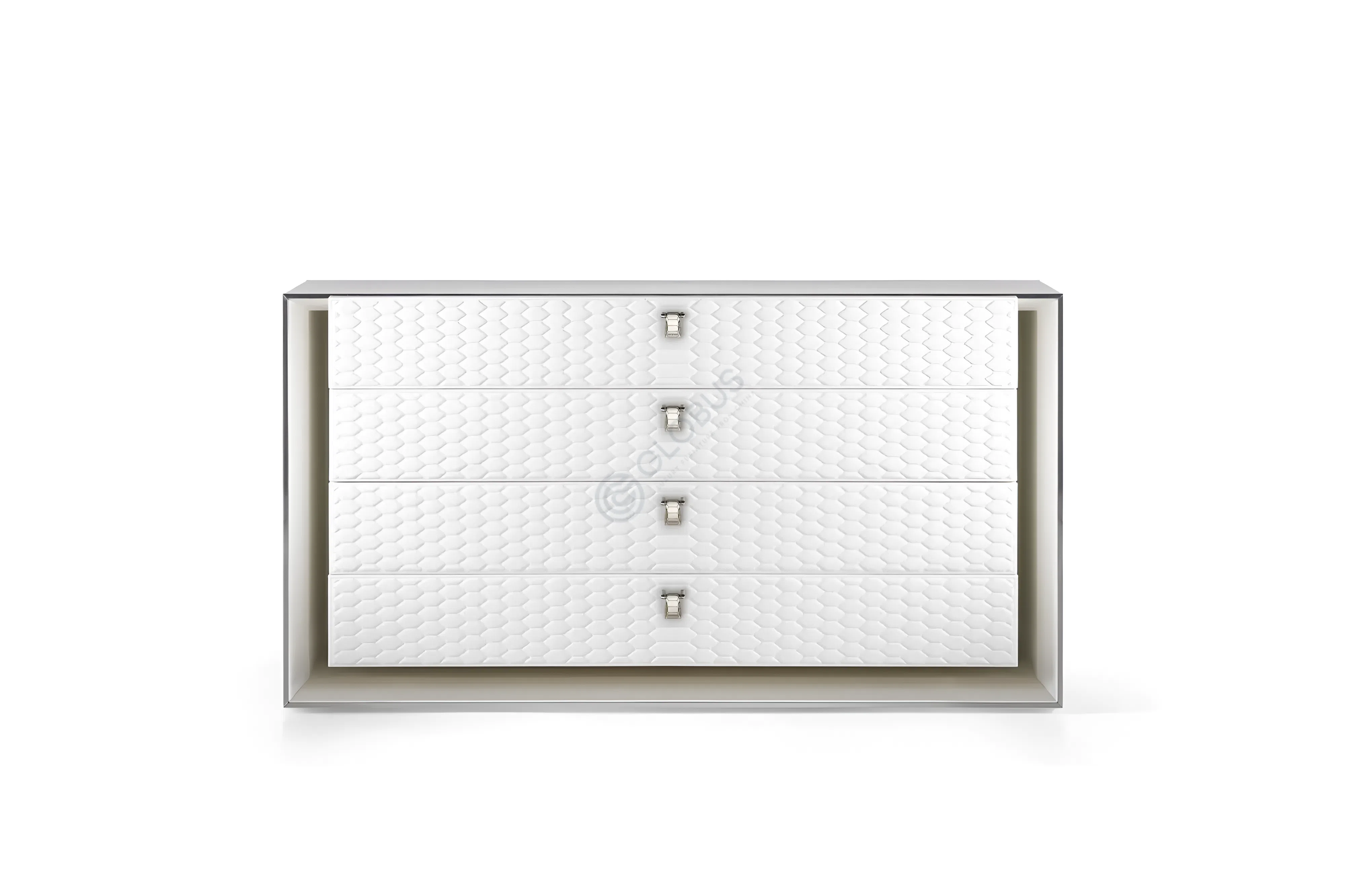 Фасад выдвижного ящика украшает деликатный текстурный узор, напоминающий элегантную сотовую структуру, который придает изделию уникальное тактильное и визуальное измерение. Эта особенность в сочетании с лаконичной ручкой и общим светлым тоном корпуса создает сбалансированный и притягательный дизайн.