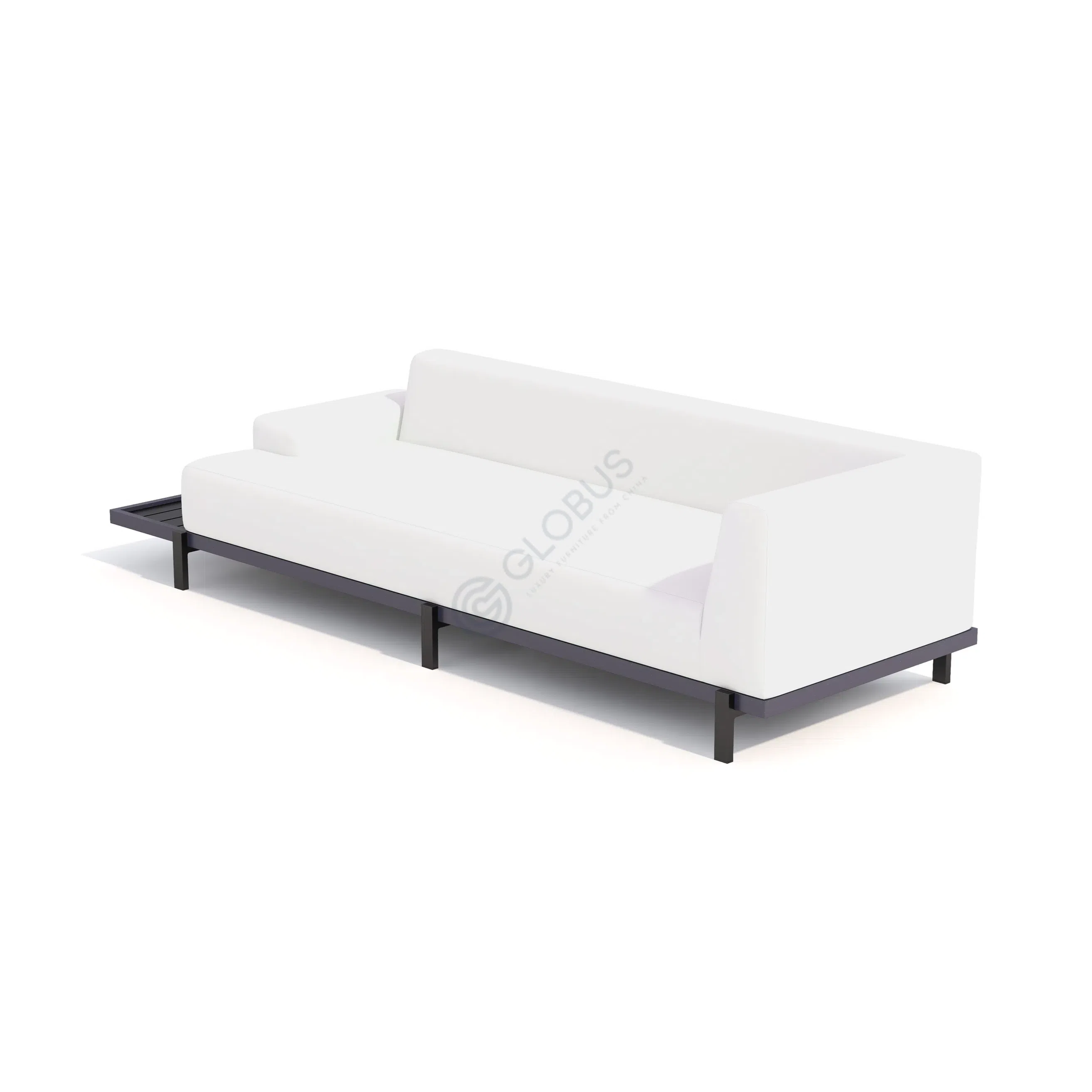Основание дивана выполнено из прочного алюминия, обеспечивающего надежность и долговечность конструкции. Мягкая часть обтянута высококачественным текстилем, предлагая непревзойденный комфорт и приятные тактильные ощущения. Эффектным дополнением служит встроенная столешница из натурального дерева, добавляющая тепла и практичности, идеально подходящая для размещения напитков или декоративных предметов.