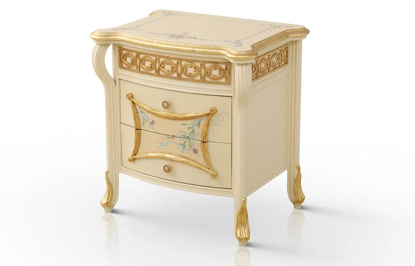 Основа изделия выполнена из массива натурального дерева. Каркас украшен виртуозной резьбой, демонстрирующей цветочные мотивы и утонченные изгибы, характерные для стиля. Изящные ножки завершают образ, добавляя легкости и грации всей конструкции.