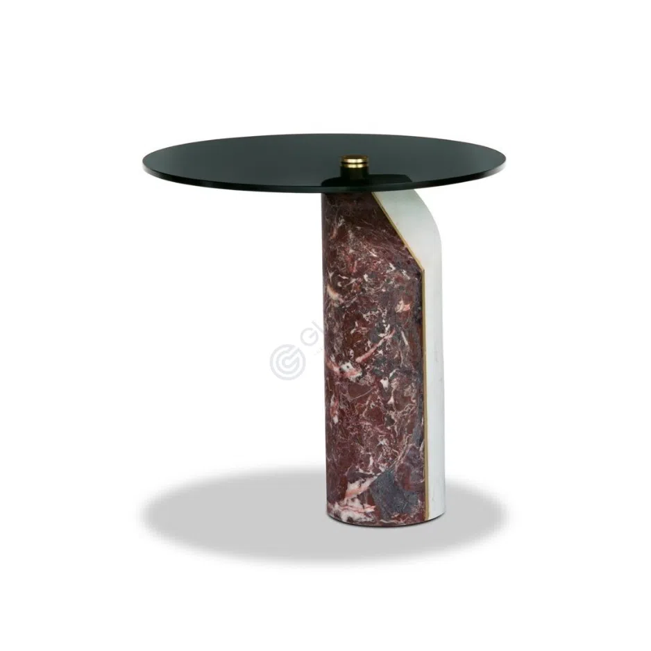 Основание представляет собой художественную композицию из натурального камня. Массивное основание из мрамора с глубокими винными оттенками и выразительными прожилками контрастирует с расположенной выше скульптурной деталью из темного камня с более тонкими белыми узорами. Сочетание двух видов камня придает опоре динамичность и эксклюзивный вид. Изящный акцент в виде полированной металлической вставки завершает образ, добавляя нотку утонченности.