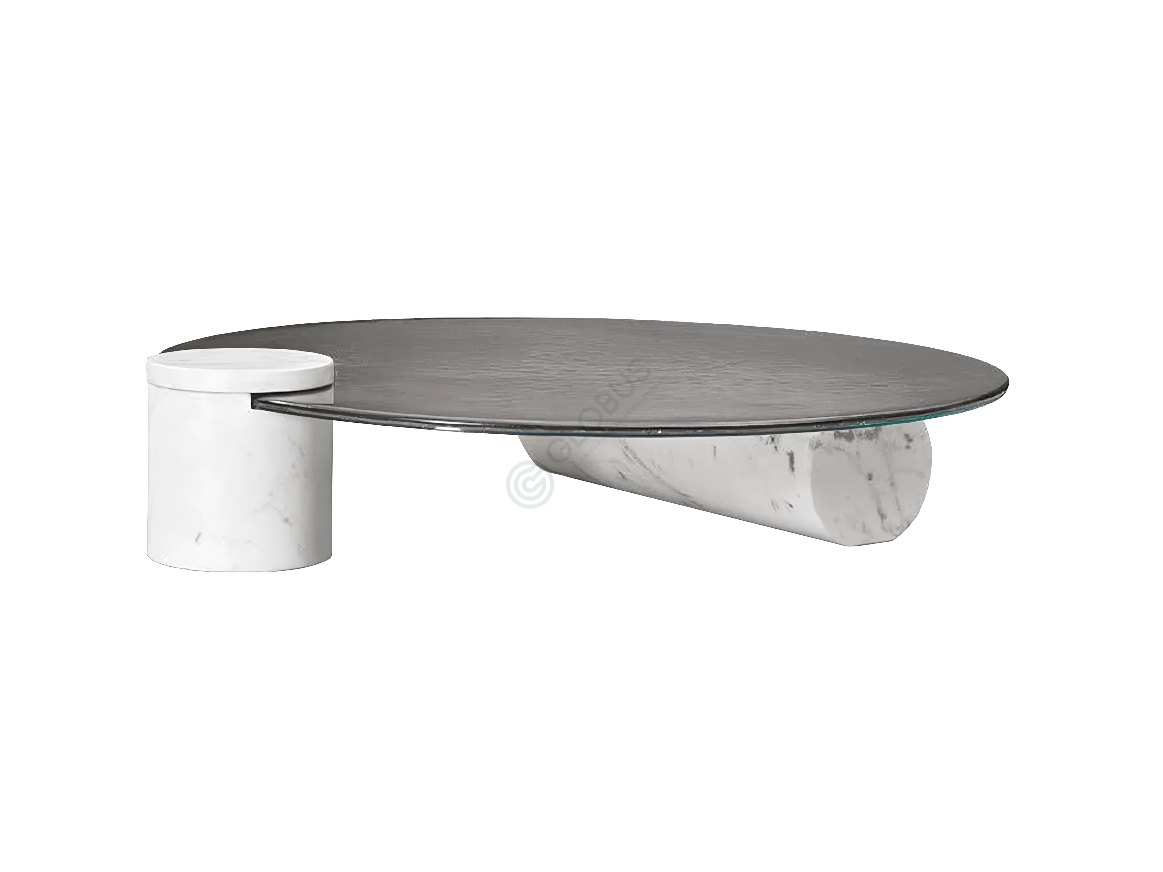 Столешница из закаленного стекла темного оттенка элегантно контрастирует с мраморной базой. Ее гладкая овальная форма создает ощущение легкости и воздушности, словно она парит над массивным основанием. Прочное стекло обеспечивает надежную поверхность для размещения напитков, книги или декоративных предметов.