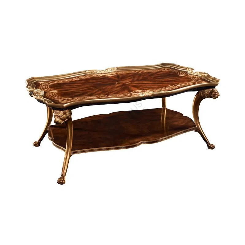 Поразительные декоративные элементы украшают его конструкцию. Опоры, искусно вырезанные в виде величественных голов животных и лап с когтями, придают ощущение силы и исторического великолепия. Нижняя полка предлагает функциональную, но при этом прекрасную поверхность. Столешница в форме подноса с витиеватым кантом добавляет нотку королевской изысканности.
