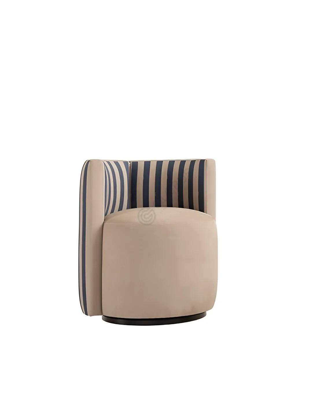 Обивка, выполненная из качественного текстиля, демонстрирует интересную игру контрастов. Мягкое сиденье и передняя часть представлены в спокойном бежевом оттенке, создавая ощущение уюта, в то время как изогнутая спинка и боковая панель украшены ритмичным узором из синих полос на светлом фоне, добавляя динамики и шарма.