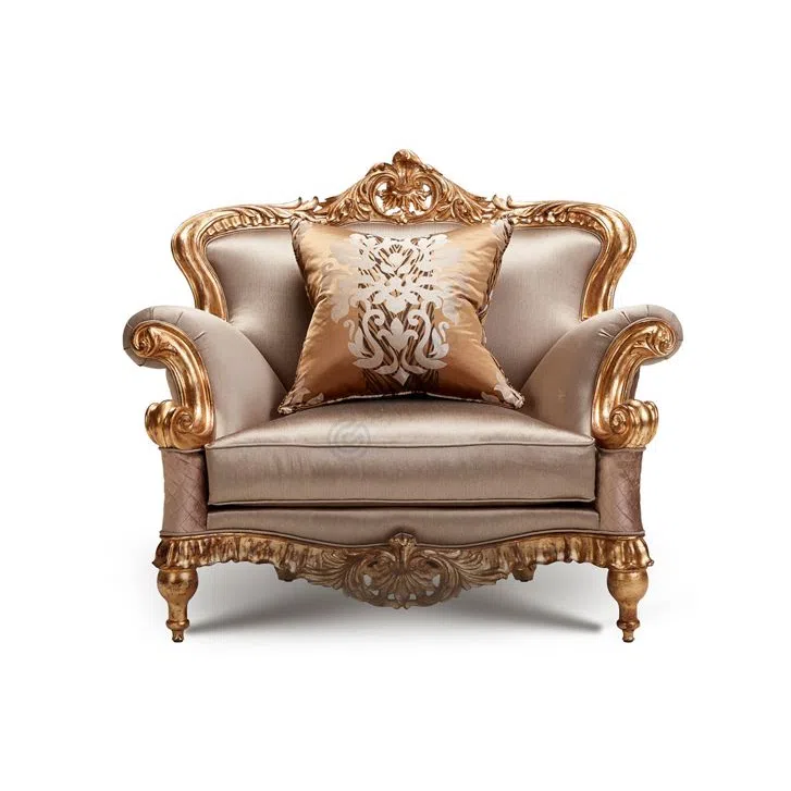 Каркас изысканно украшен резьбой и покрыт сияющим золотистым оттенком, демонстрируя плавные линии и декоративные элементы, привлекающие взгляд. Обитое высококачественным текстилем, сиденье предлагает поверхность утонченной текстуры и визуальной глубины, прекрасно дополняя декоративное дерево.