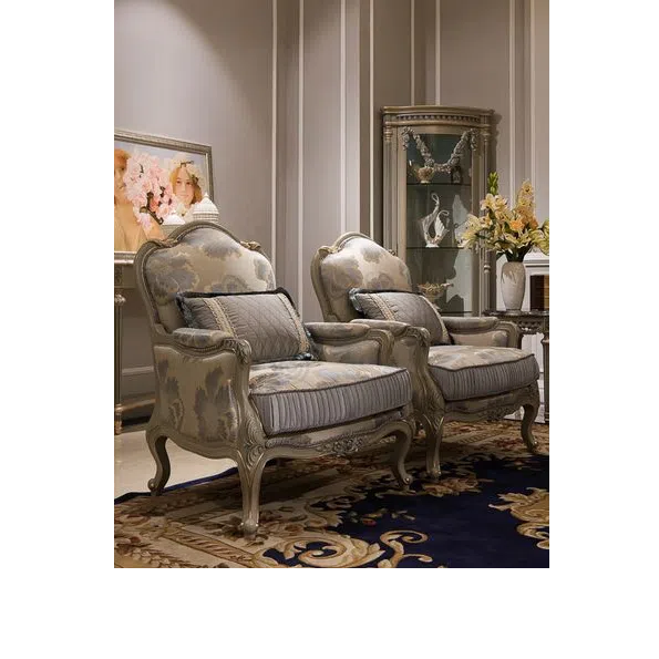 Каркас изделия изготовлен из натурального дерева, украшенного искусной резьбой, которая подчеркивает благородство линий. Сиденье и спинка обиты высококачественным текстилем с деликатным орнаментом, приятным на ощупь. Подушки, наполненные натуральным пухом, обеспечивают исключительную мягкость и уют.
