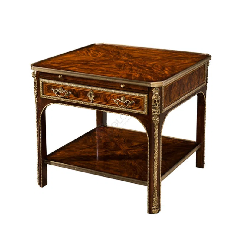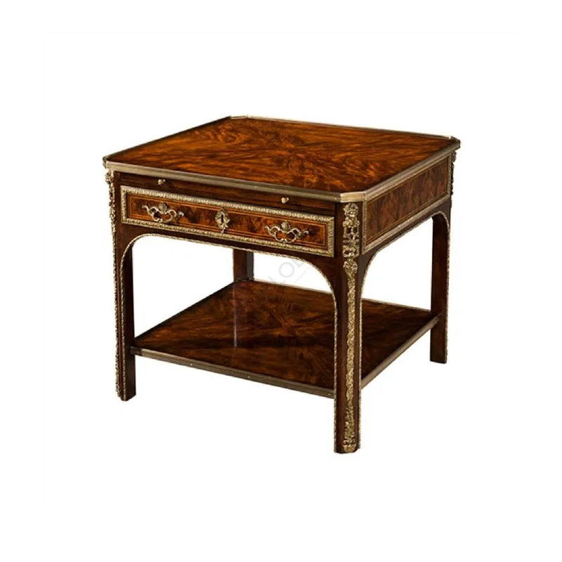 Медные детали и фурнитура добавляют изделию роскоши и завершенности. Изящные ручки ящиков и декоративные накладки, выполненные из меди, обладают тонкой проработкой узоров, что придает столику дополнительный шарм. Пара выдвижных ящиков предлагают удобное место для хранения мелочей, а изогнутая нижняя полка добавляет воздушности и практичности, позволяя разместить книги или декоративные предметы. Каждая линия и элемент говорят о высоком качестве исполнения и внимании к деталям, присущем мебели премиум-класса.