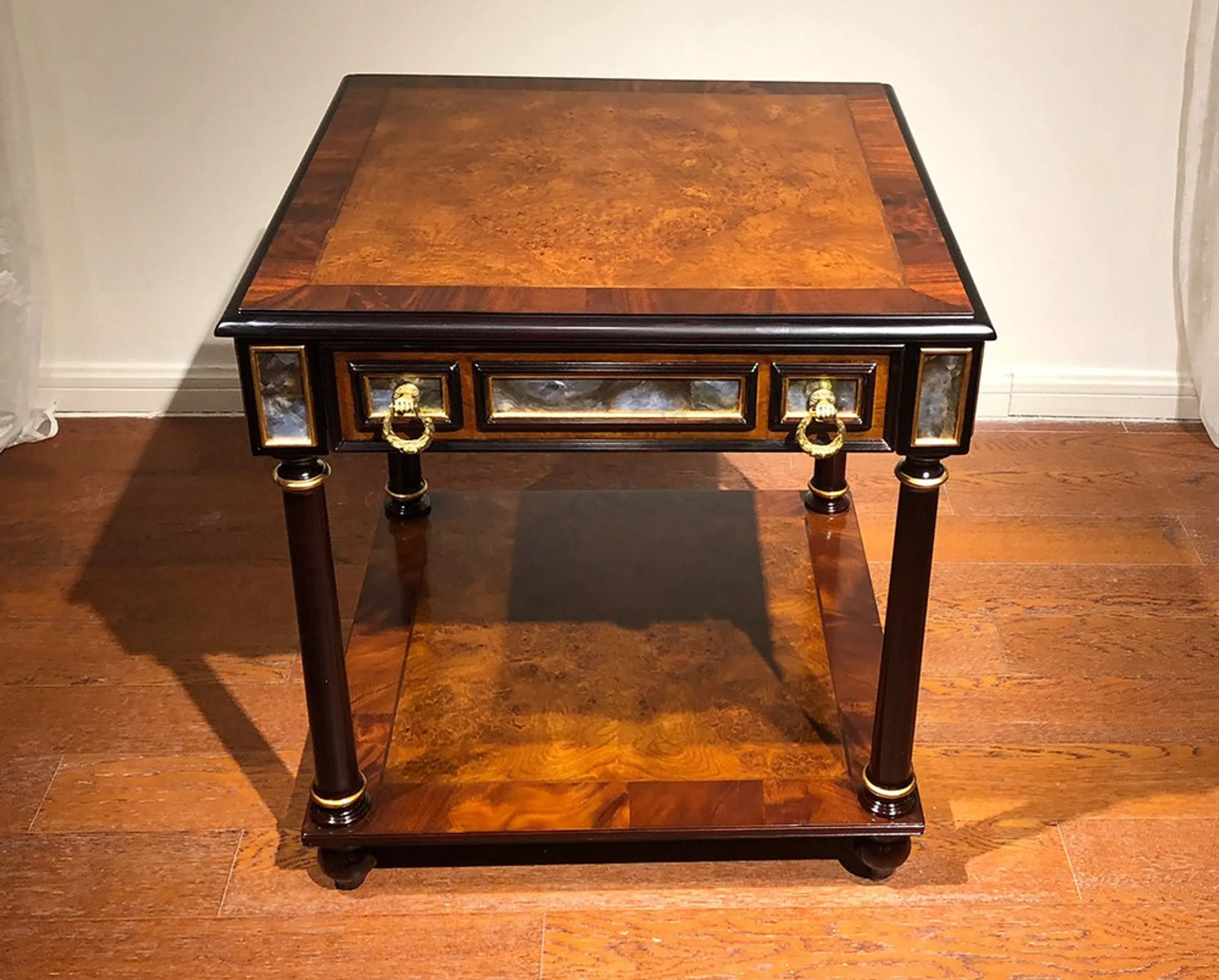 Основу предмета составляет массив натурального дерева, обработанный с исключительным мастерством. Фасад изделия покрыт тонким слоем серебряного листа, который придает поверхности нежное сияние и особую глубину, отражая свет и добавляя пространству воздушности. Столешница выполнена в контрастном темном оттенке, ее полированная поверхность подчеркивает роскошь и добротность материала.