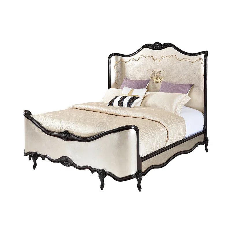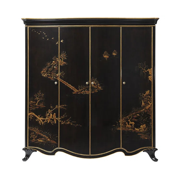 Центральный ящик украшен изысканной росписью с изображением цветочного мотива, выполненной вручную, что делает каждый элемент уникальным. Декоративные уголки и узорная фурнитура дополняют образ, подчеркивая внимание к деталям и принадлежность к высокому стилю. Продуманное расположение отделений для хранения позволяет разместить необходимые предметы, сохраняя при этом чистоту линий фасада.