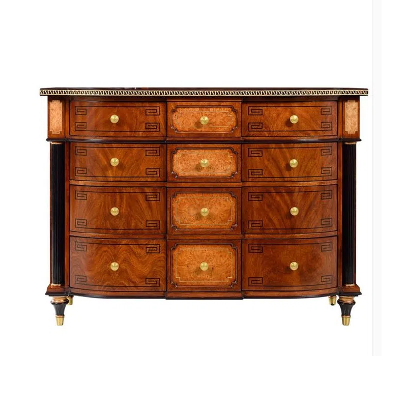 Изготовленный из массива натурального дерева, этот элемент интерьера обладает прочностью и долговечностью. Фактура шпона на фасадах ящиков добавляет глубины и уникального рисунка дереву, подчеркивая его природную красоту. Деликатные вставки из меди придают изделию утонченный блеск и завершенность.