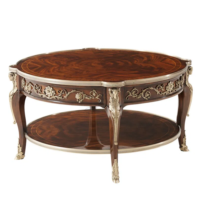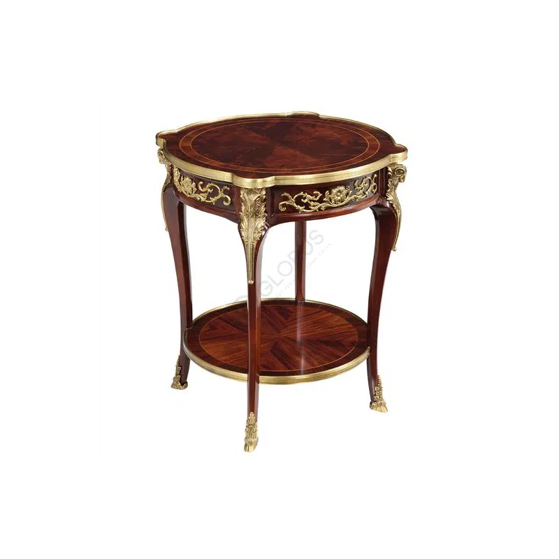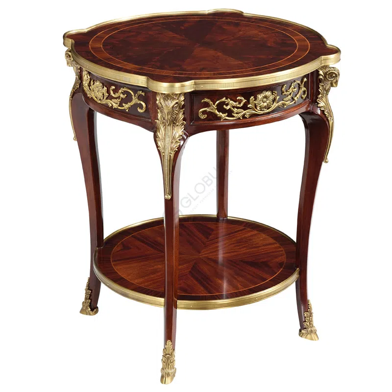 Изящная форма верхней части изделия гармонично дополняется выдвижным ящиком, украшенным декоративными ручками. Каждая деталь, от тонкой инкрустации по краю столешницы до изгибов нижнего яруса, свидетельствует о внимании к мастерству.