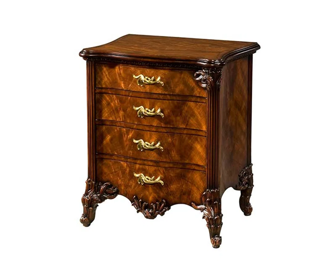 Лицевая сторона украшена красивым узором древесины, создающим гармоничный рисунок. Шесть просторных выдвижных ящиков обеспечивают удобное хранение. Каждый ящик оснащен изящной металлической ручкой с утонченным дизайном, добавляющей шарма. Декоративные элементы на ножках и нижней части фасада подчеркивают принадлежность к классическому стилю, демонстрируя внимание к деталям.