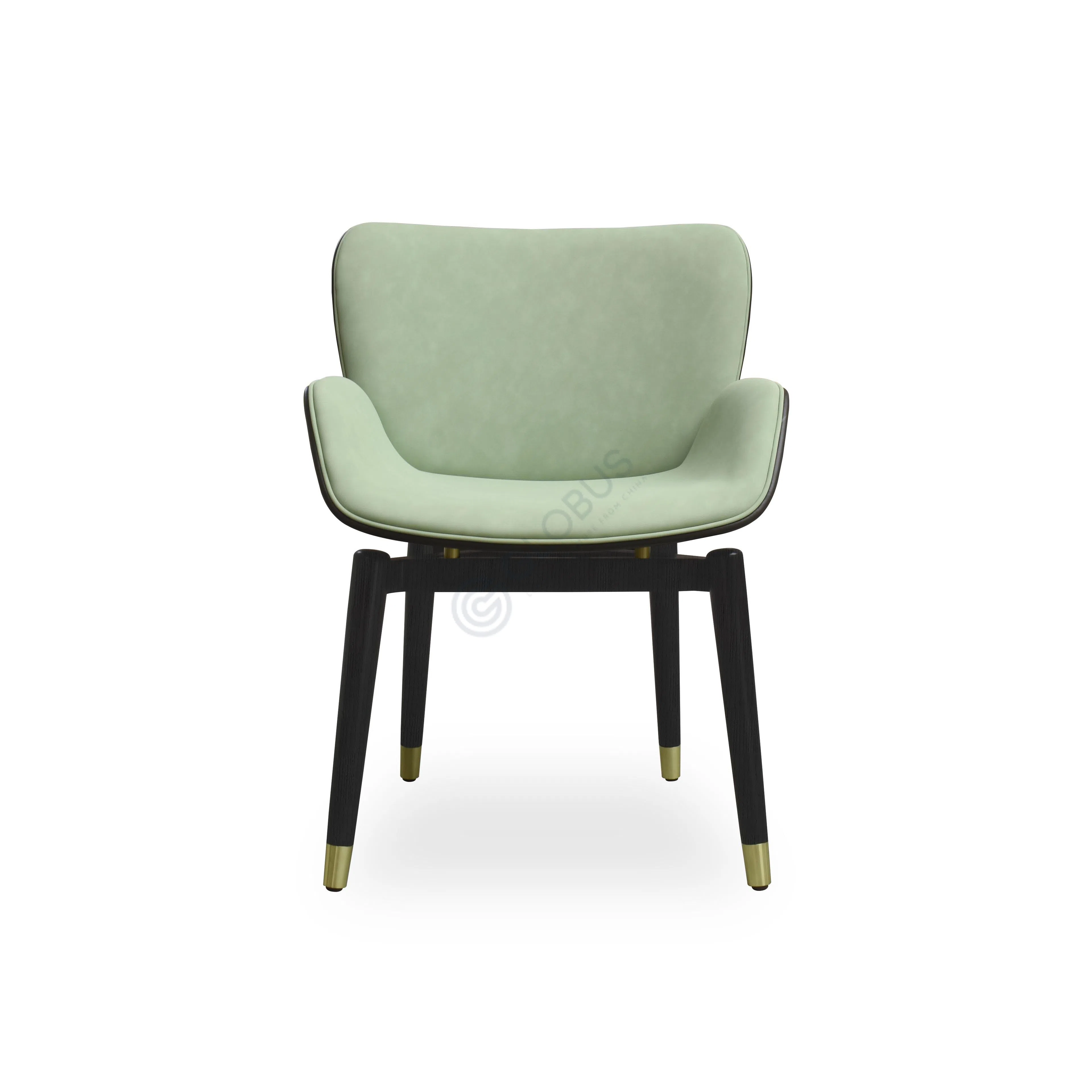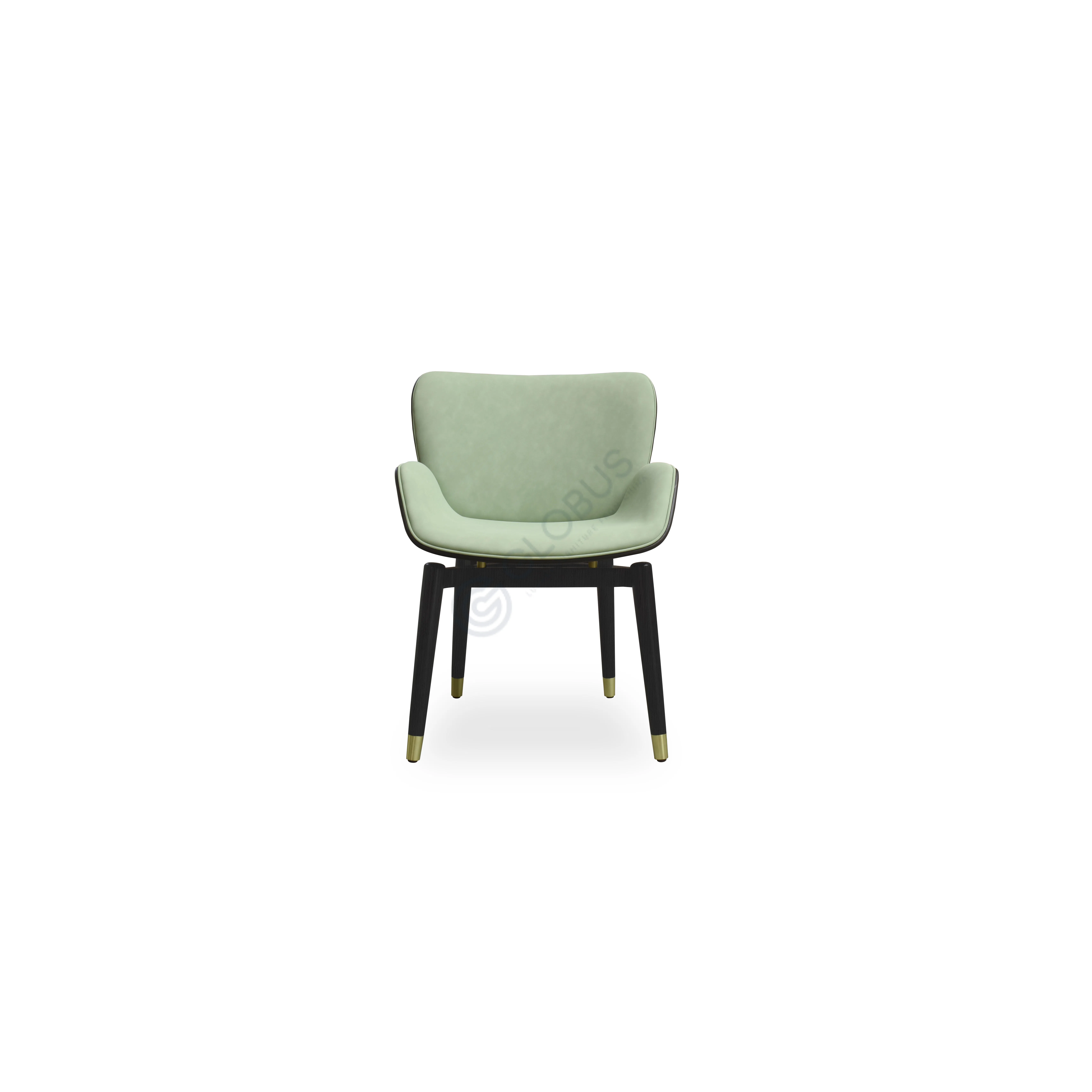 Основа конструкции выполнена из натурального дерева и прочной фанеры, обеспечивая надежность и долговечность. Изогнутая спинка и подлокотники, обтянутые качественной экокожей с характерным рисунком, предлагают высокий уровень комфорта. Завершающим штрихом служат тонкие опоры с элементами из нержавеющей стали, подчеркивающие утонченный характер предмета.