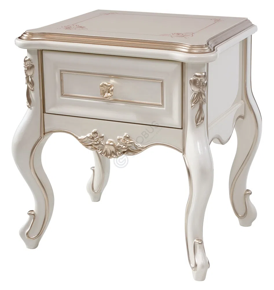 Столик отличается плавными линиями и изысканной резьбой, характерной для классического стиля. Изящные изогнутые ножки придают ему легкость и утонченность. Удобные выдвижные ящики предлагают место для хранения косметики и аксессуаров. Овальная форма зеркала, обрамленная декорированной рамой, завершает гармоничный образ.