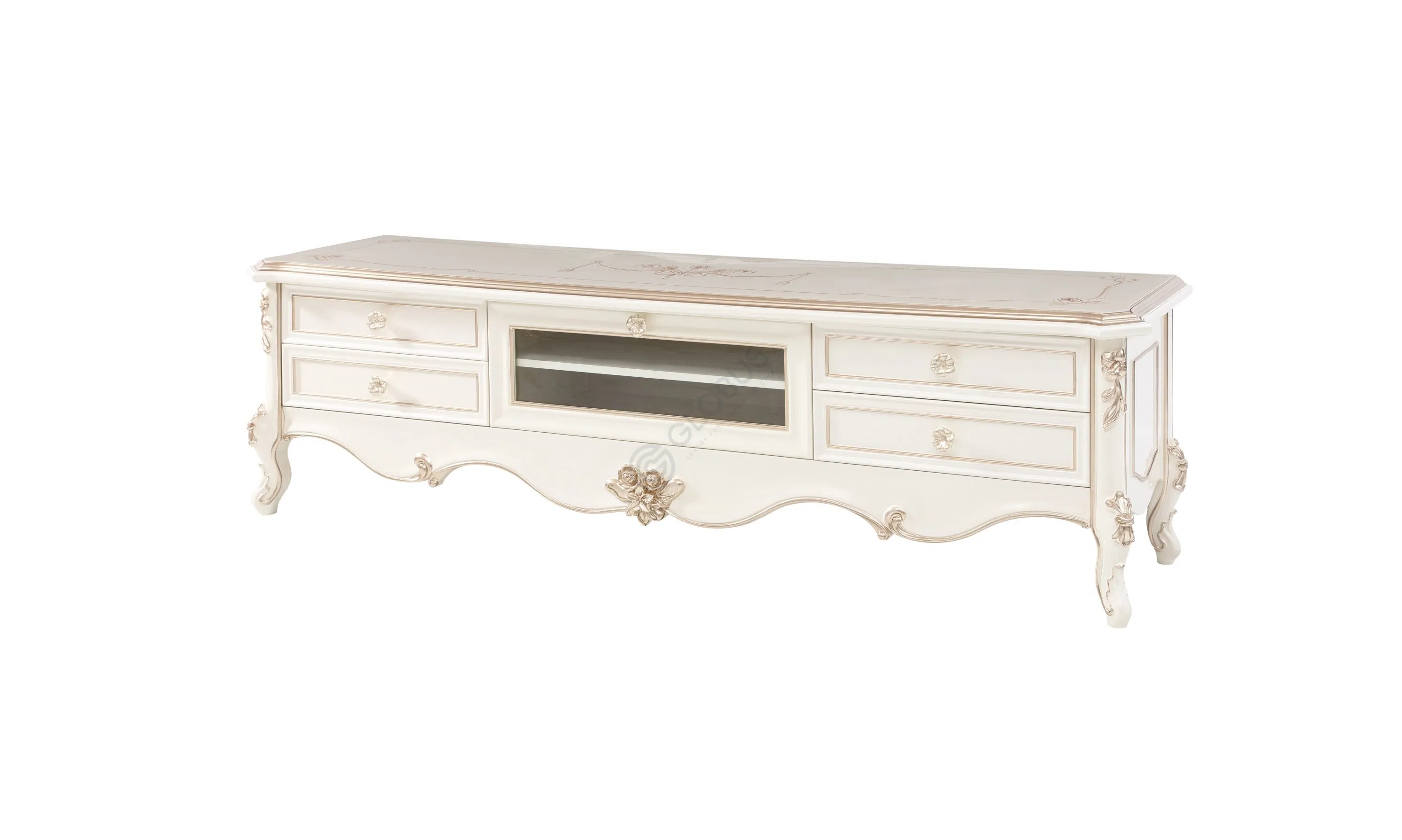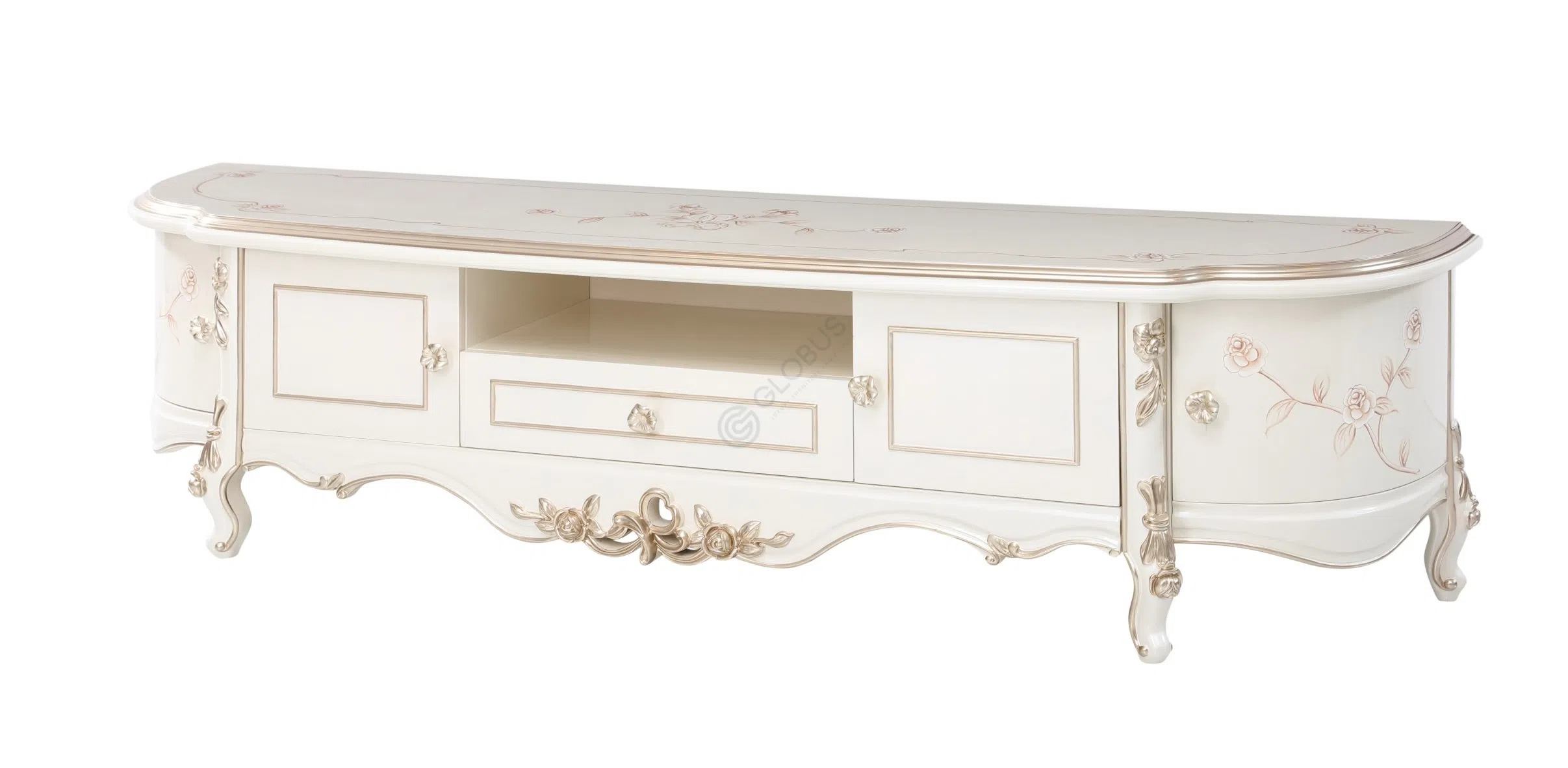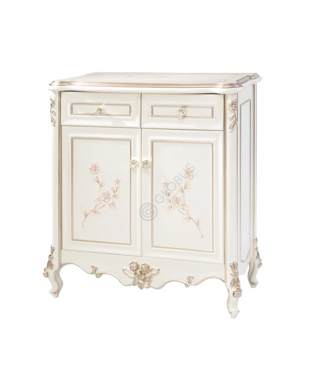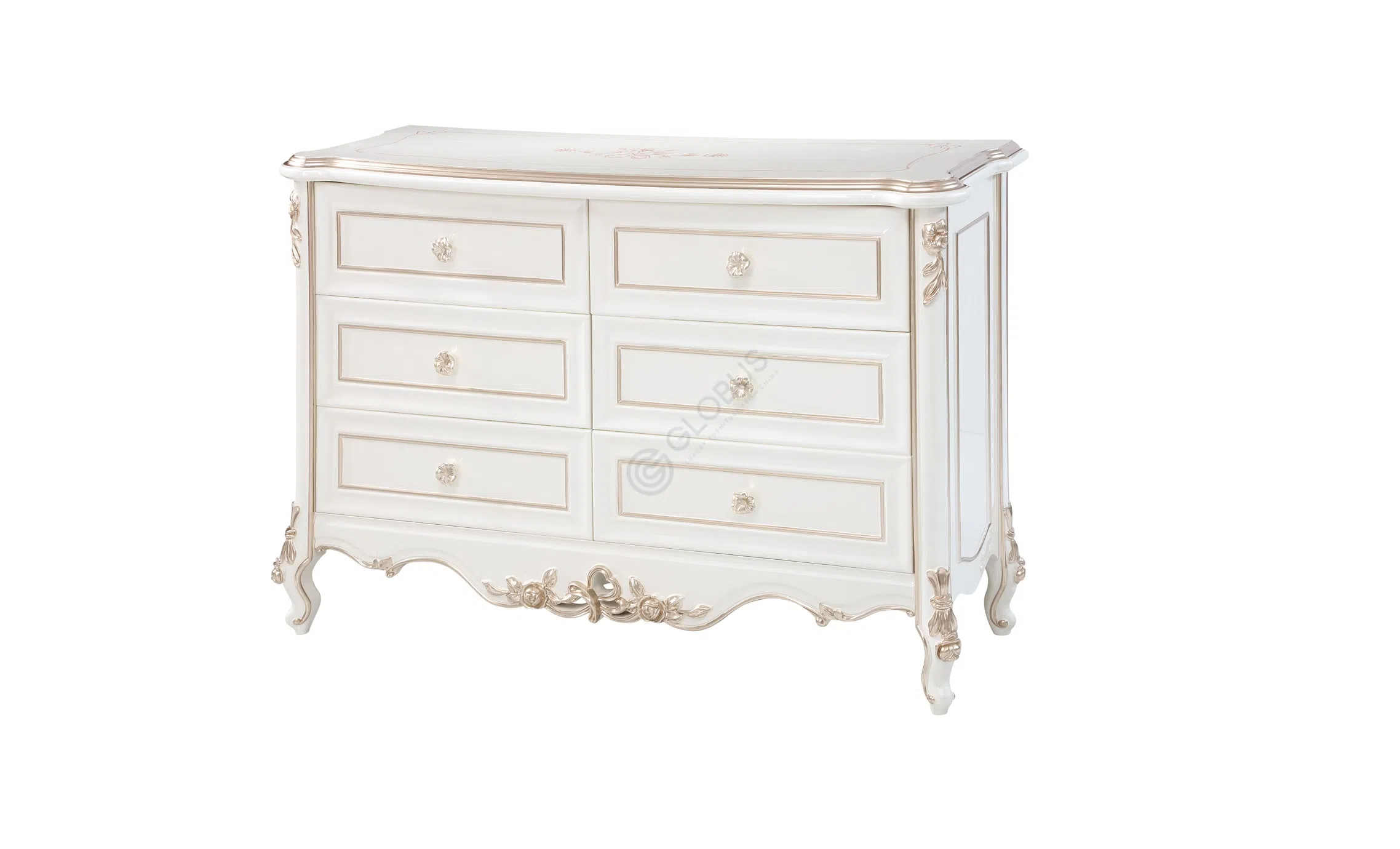 Фасад комода украшен тончайшей резьбой и декоративными элементами, подчеркивающими принадлежность к высокому стилю. Каждая ручка на вместительных ящиках является небольшим произведением искусства, добавляя блеск и шарм. Изогнутые ножки с рельефным декором завершают образ, придавая ему особую грацию.
