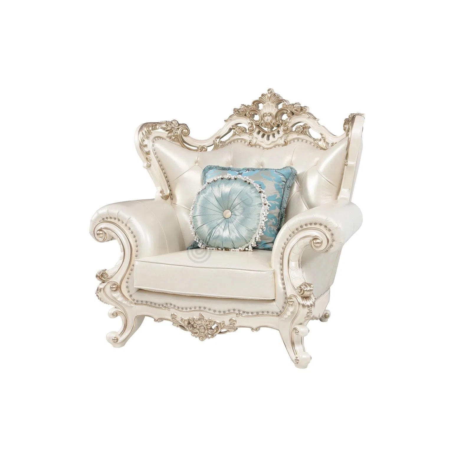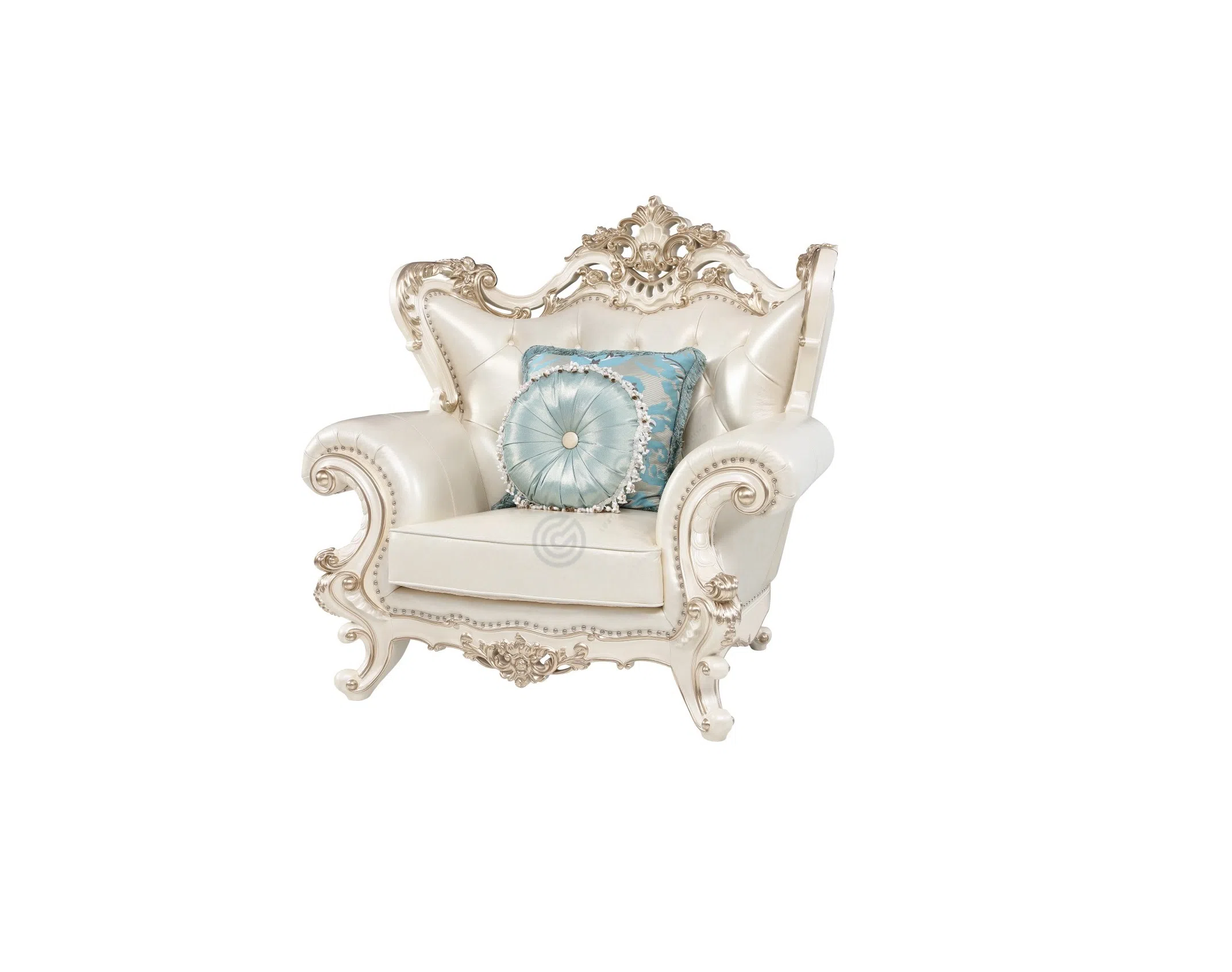 Каркас, созданный из натурального дерева, украшен изысканной резьбой. Утонченные узоры на ножках, подлокотниках и верхнем крае спинки подчеркивают роскошь ручной работы. Светлая отделка с эффектом патины придает ему благородный, исторический вид.