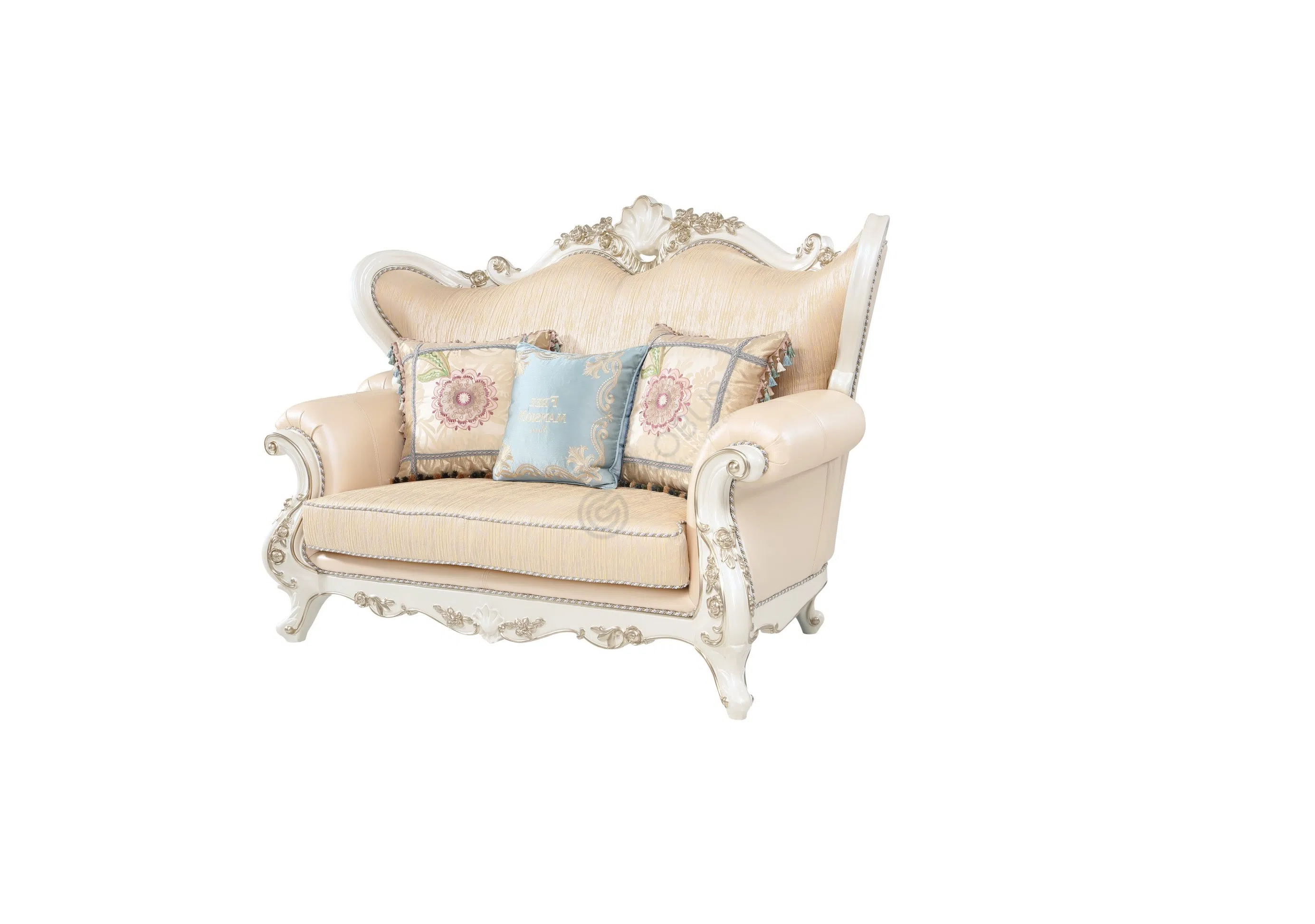 Каркас выполнен из отборного натурального дерева, украшенного виртуозной ручной резьбой. Светлая отделка древесины подчеркивает объемные декоративные элементы, включая сложный узор на спинке и изящные ножки. Обивка сочетает благородный текстиль с нежной текстурой и гладкий материал на подлокотниках, создавая приятный тактильный контраст и добавляя практичности. Внимание к деталям прослеживается в аккуратной окантовке и декоративной подушке, завершающей эстетику.