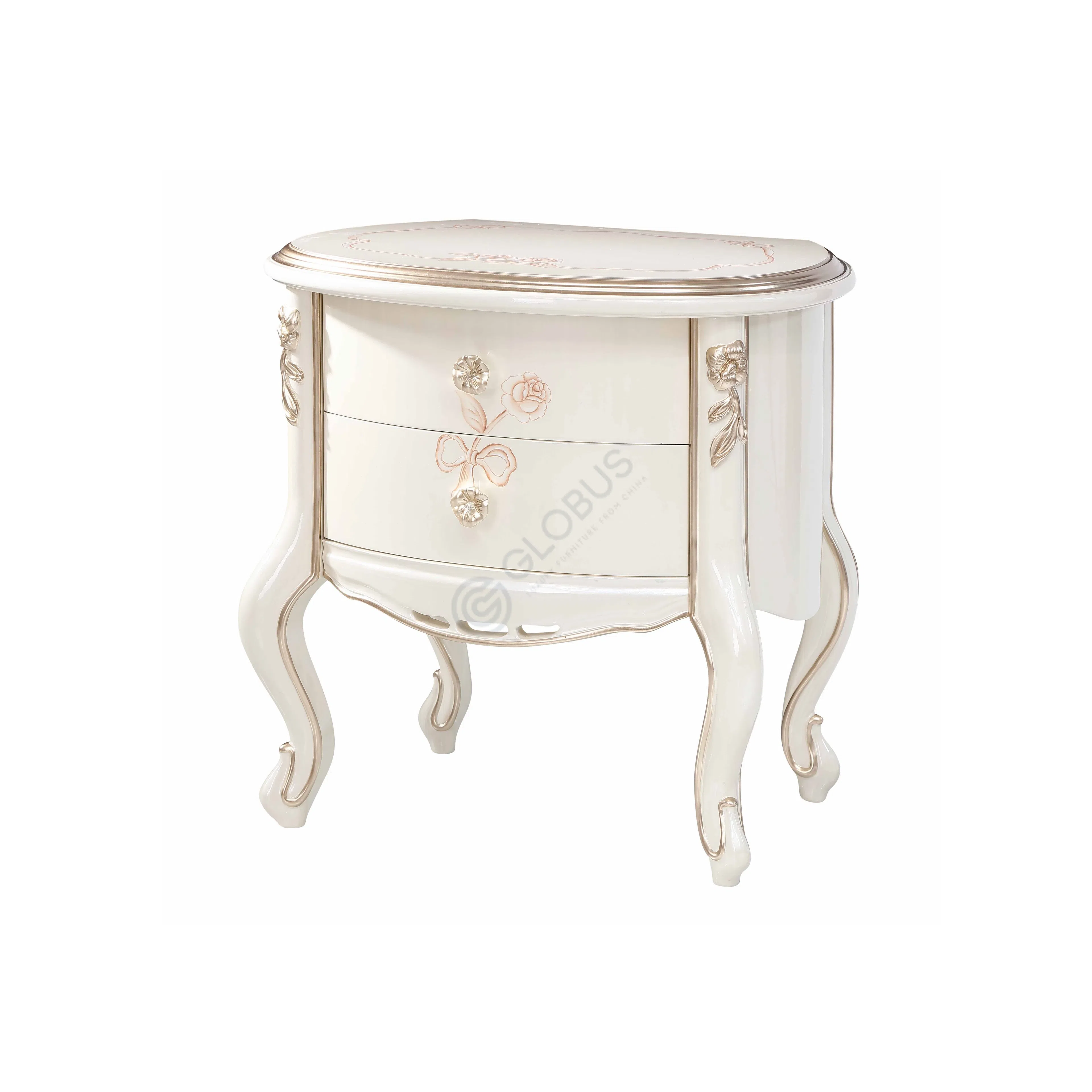 Плавные линии столешницы и изогнутые ножки придают столику изысканный силуэт. Каждая деталь отделки, от тонких золотистых акцентов по периметру до деликатной резьбы, подчеркивает благородство его облика. Светлый оттенок корпуса придает воздушность и легкость, гармонично сочетаясь с золочеными элементами декора, изображающими цветочные мотивы.