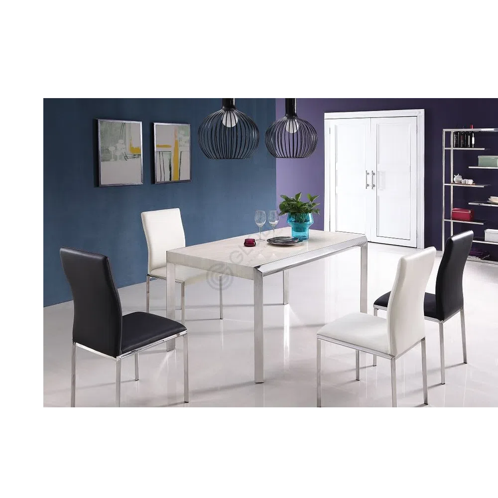 Сиденье и высокая спинка обтянуты качественной экокожей, которая приятна на ощупь и практична в использовании. Насыщенный цвет обивки гармонично сочетается с блеском основания. Прочный каркас выполнен из полированной нержавеющей стали, что обеспечивает не только долговечность конструкции, но и придает стулу визуальную легкость и воздушность.