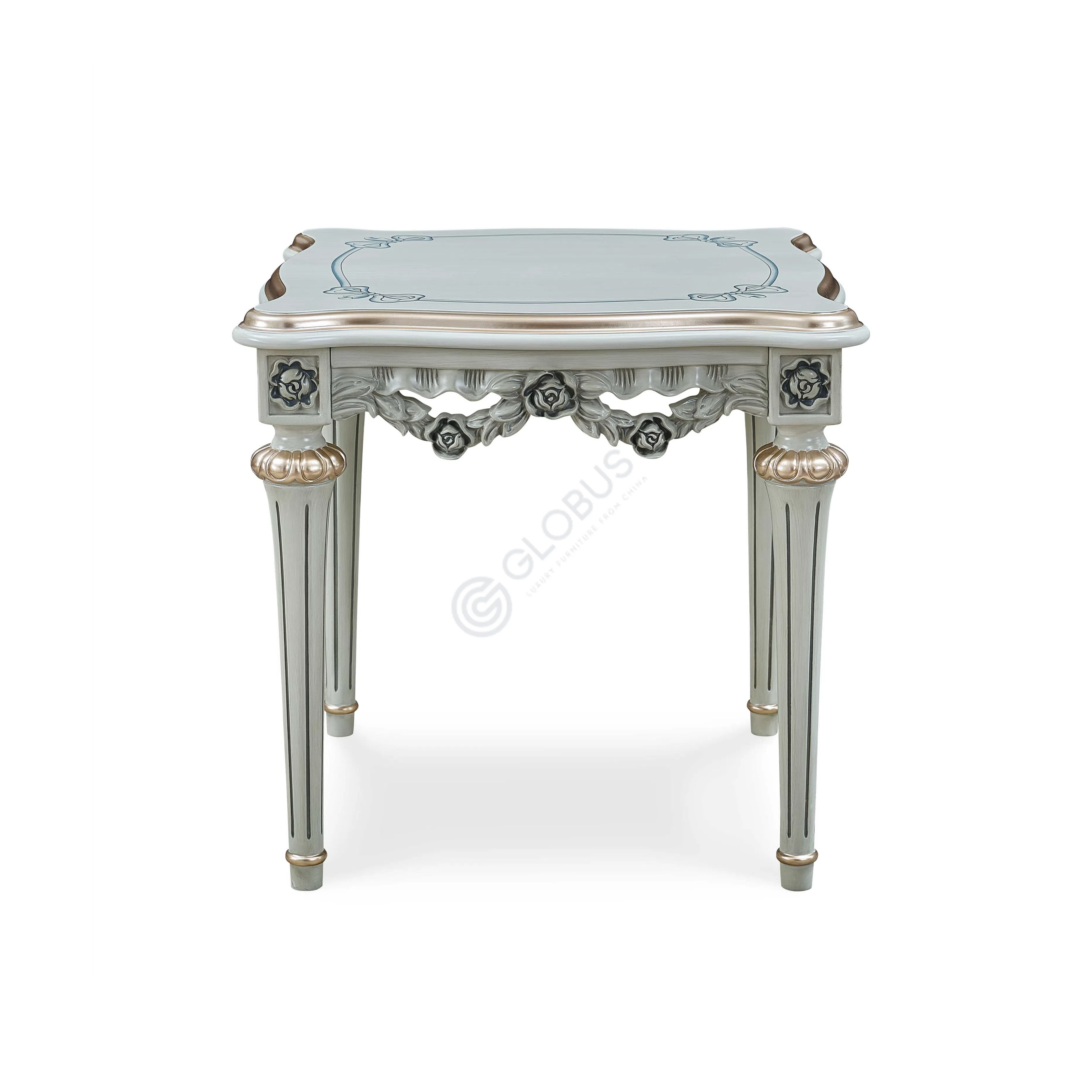 Изысканная резьба украшает боковые грани столешницы, создавая утонченный цветочный орнамент, напоминающий о роскоши барочных интерьеров. Каждая роза, каждый завиток выполнен с особой тщательностью. Изогнутые ножки, увенчанные золотистыми акцентами, придают предмету легкость и визуальную стремительность, гармонично дополняя декоративное основание. Отделка в светлых тонах подчеркивает рельефность декора и придает антикварный шарм.