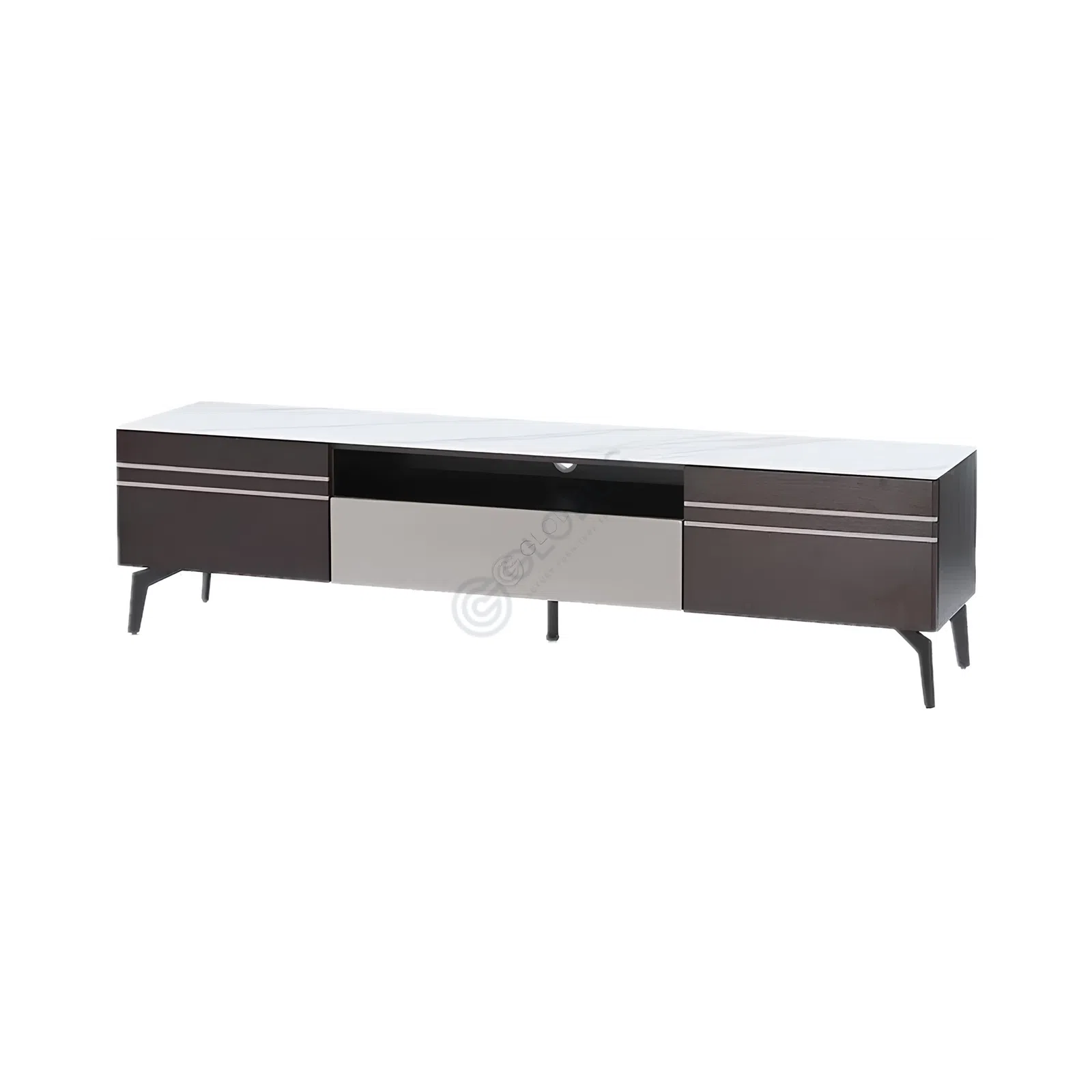 Его форма и отделка отражают эстетику модерна: чистые линии, функциональность и сдержанное великолепие. Глубокий цвет основной части контрастирует с яркой текстурой столешницы, а тонкие металлические полосы служат деликатным украшением. Элегантные опоры визуально облегчают массивную конструкцию.