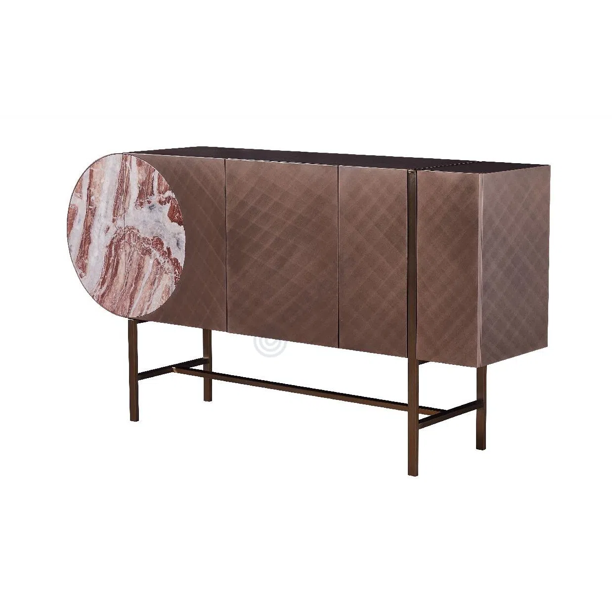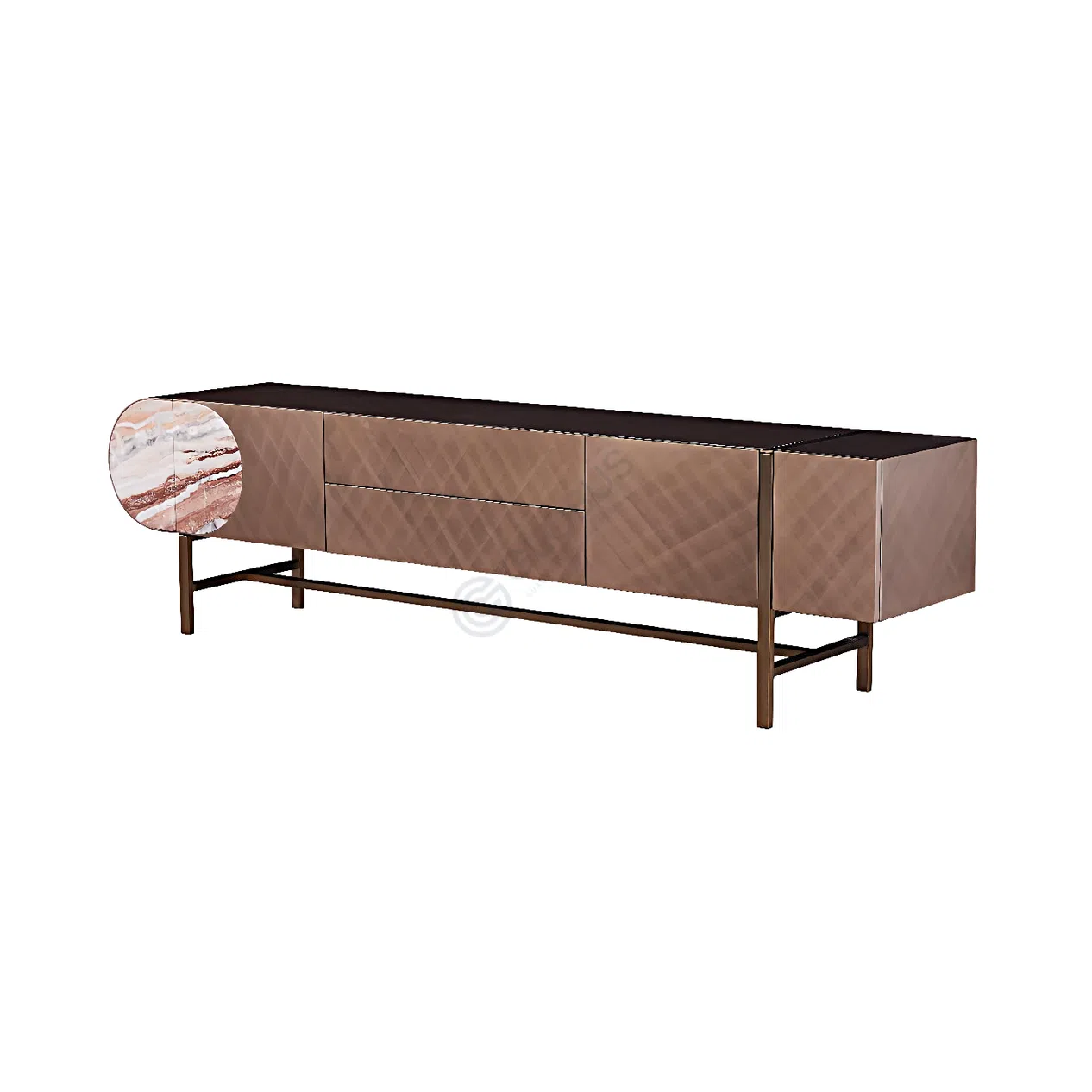 Столешница представляет собой смелое сочетание гладкого МДФ и великолепного натурального мрамора. Каждая мраморная вставка уникальна, демонстрируя неповторимый узор и глубину природного камня, что делает изделие по-настоящему эксклюзивным.