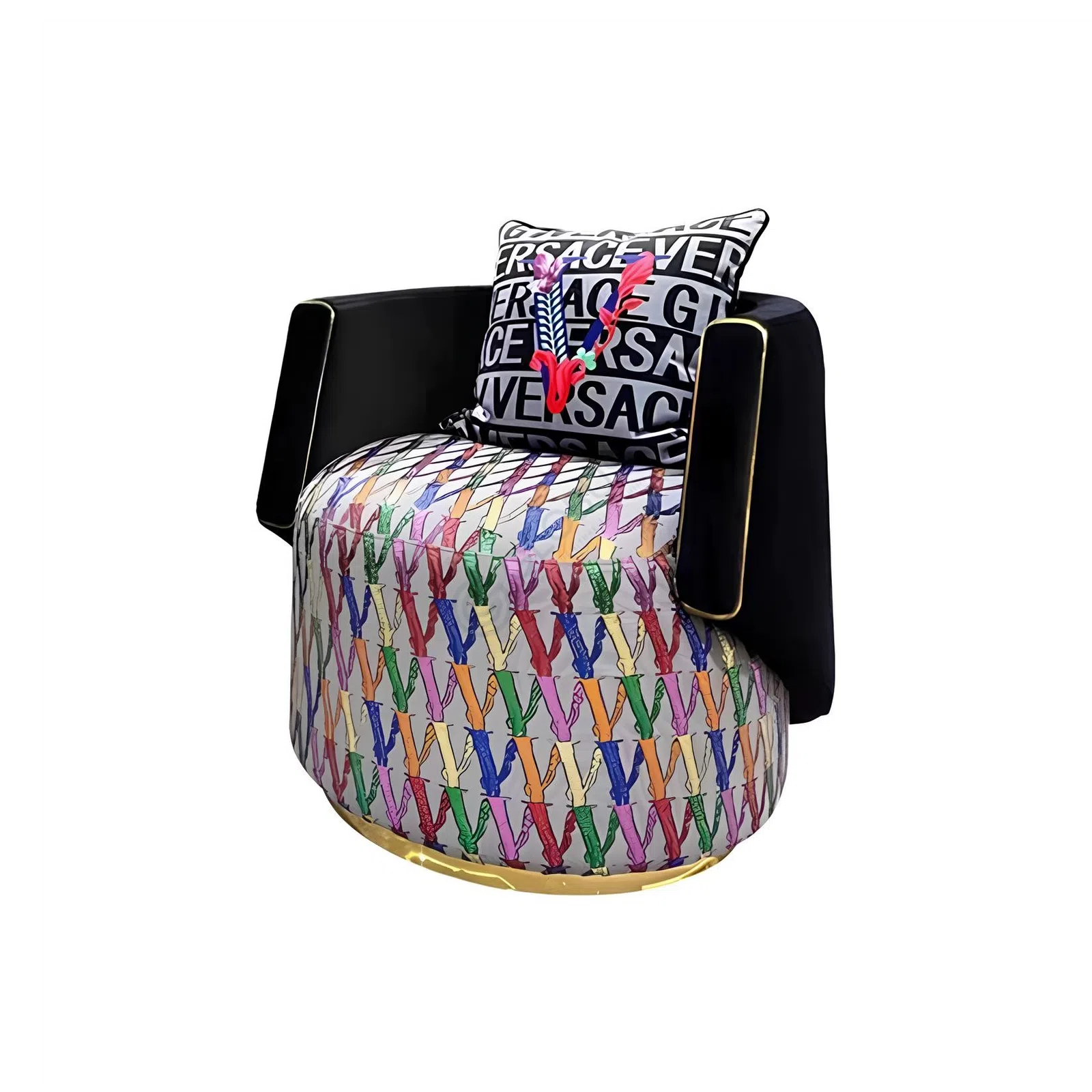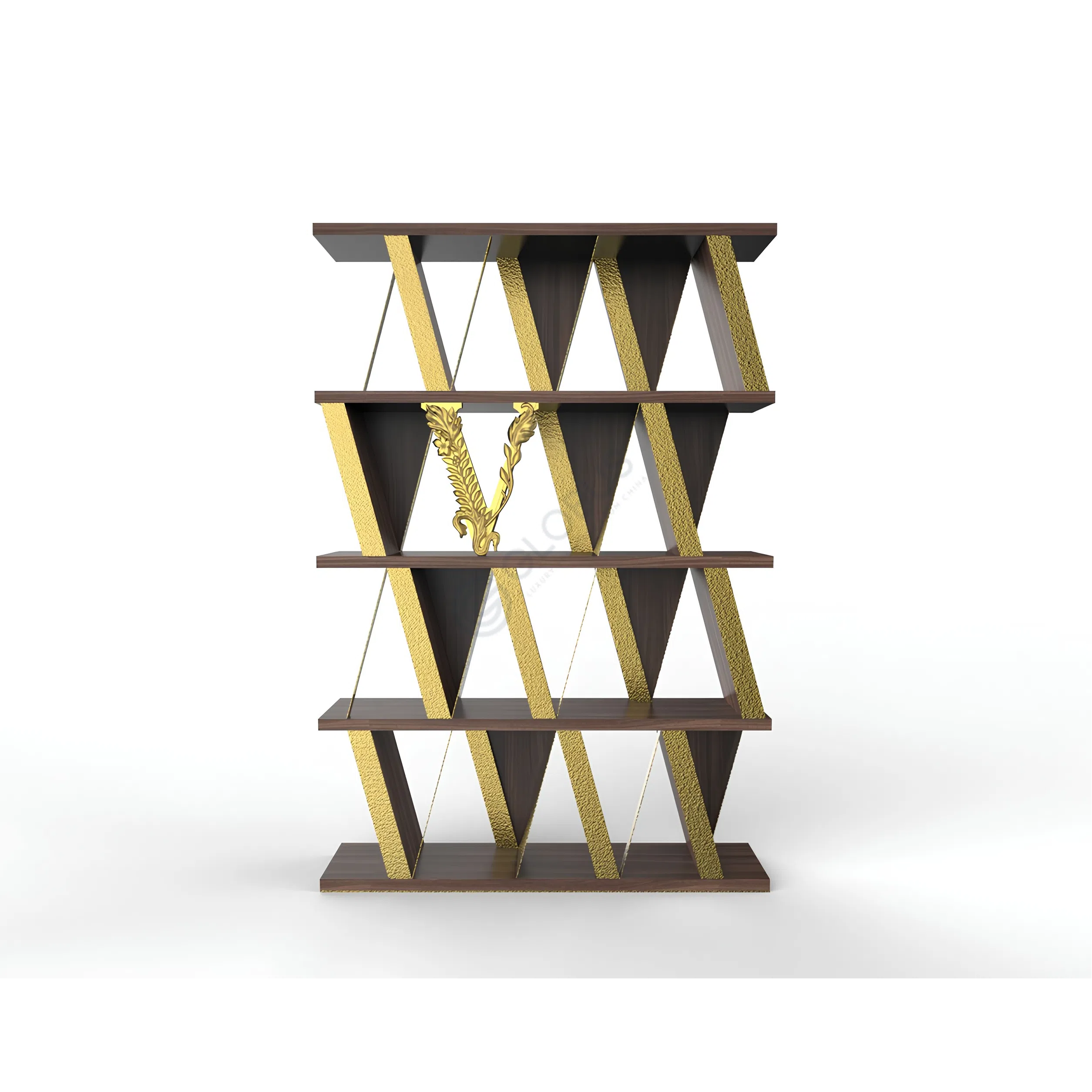 Выразительной деталью служит геометрический узор на фасаде, подчеркнутый сияющей металлической вставкой золотистого цвета, расположенной чуть выше. Особое внимание привлекает рельефная золоченая эмблема, придающая изделию узнаваемый характер и роскошный вид. Под ящиком предусмотрена открытая ниша, добавляющая воздушности конструкции и предлагающая дополнительное место для хранения или демонстрации предметов.