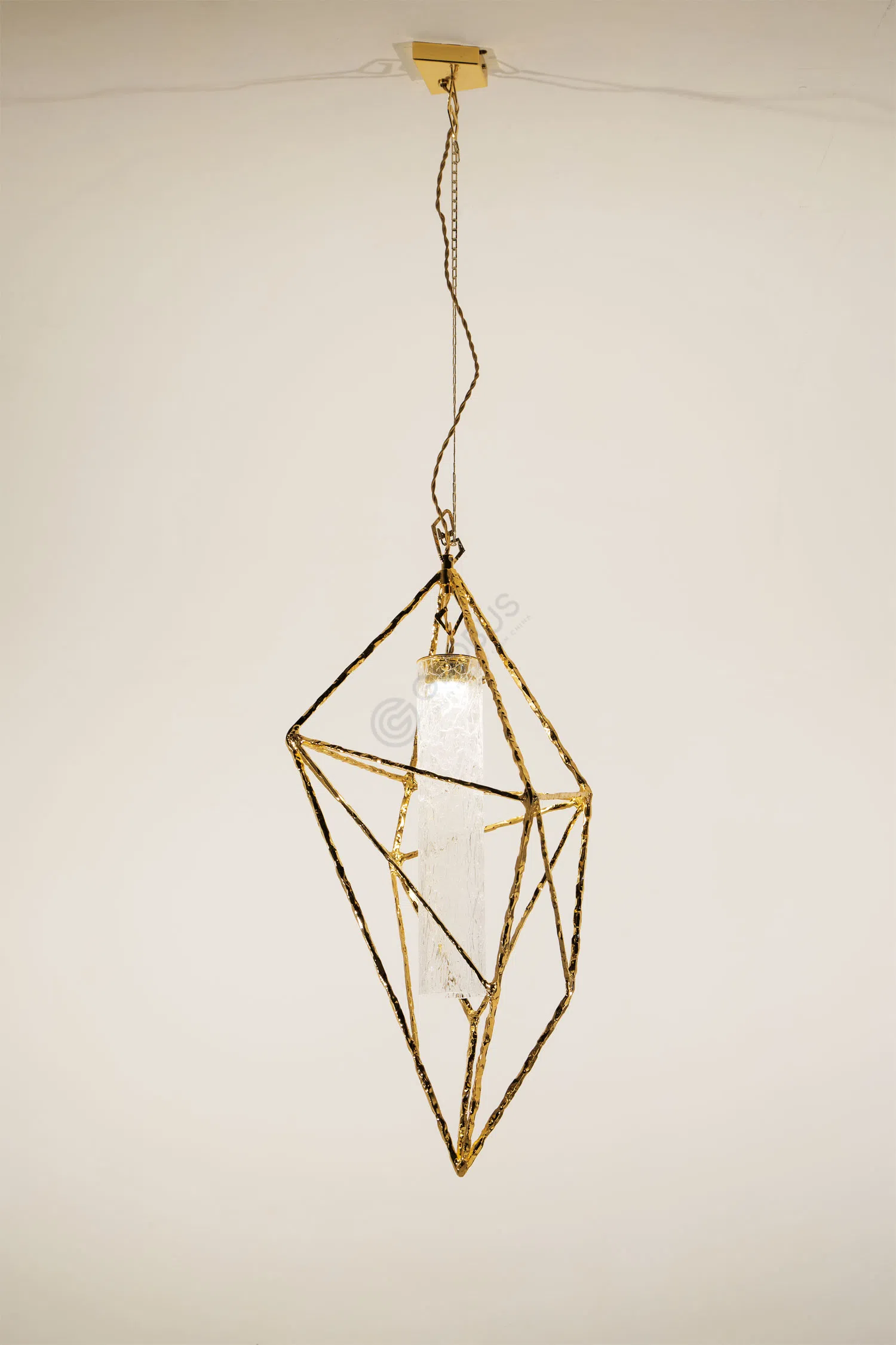 Ножка лампы выполнена из латуни, формируя ажурную геометрическую структуру. Этот элемент придает светильнику выразительность и превращает его в настоящий арт-объект. Золотистый оттенок латуни тепло переливается, добавляя изысканности силуэту.