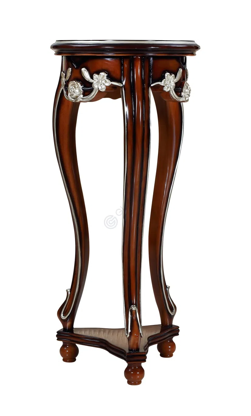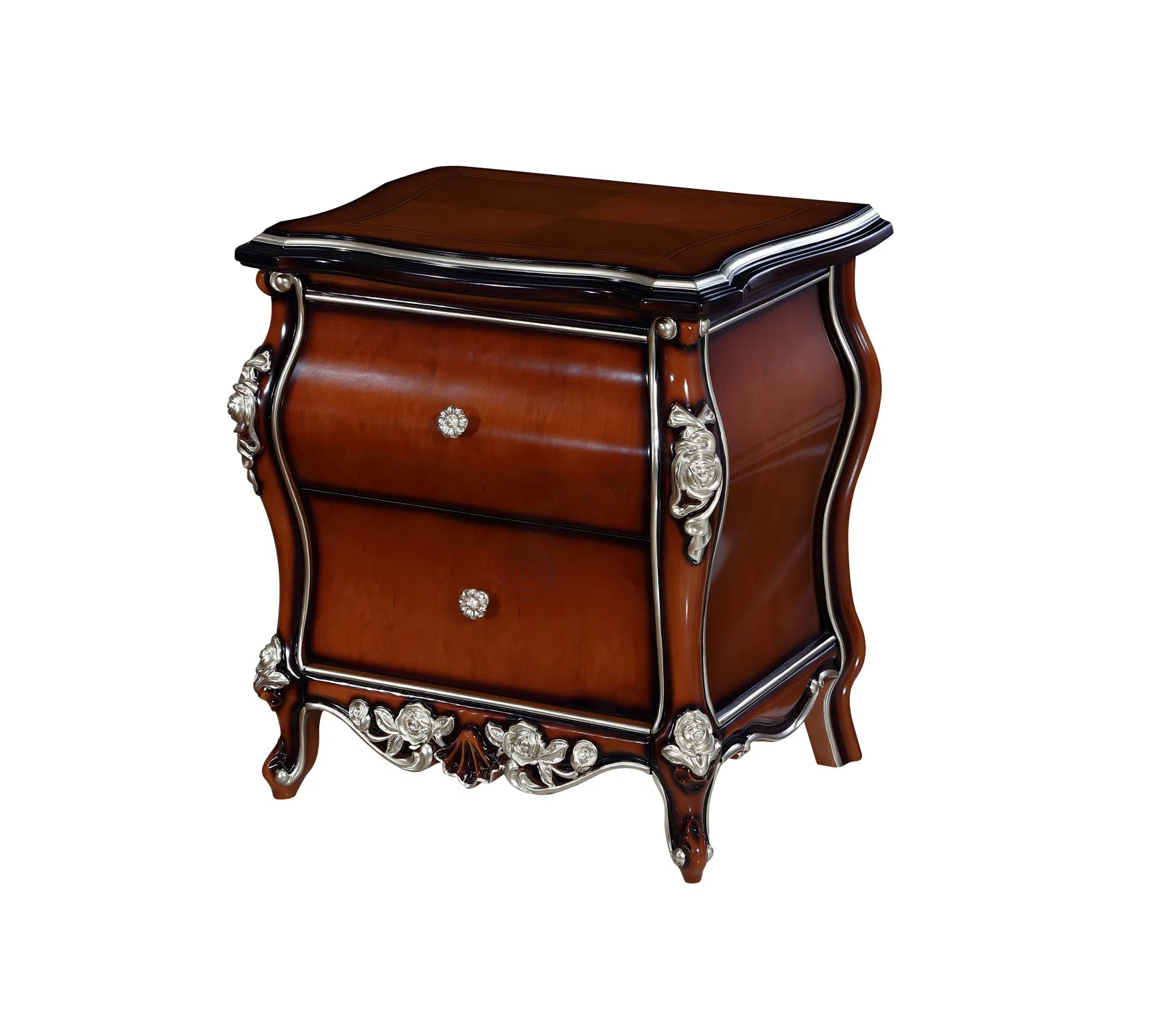 Глубокий, теплый тон поверхности подчеркнут изысканной патиной, которая выделяет текстуру древесины и придает благородный вид. Изящные резные элементы ручной работы с деликатной серебристой отделкой украшают углы и нижнюю часть изделия, изображая утонченные цветочные мотивы. Декоративные сияющие ручки завершают образ, напоминая драгоценные кристаллы.