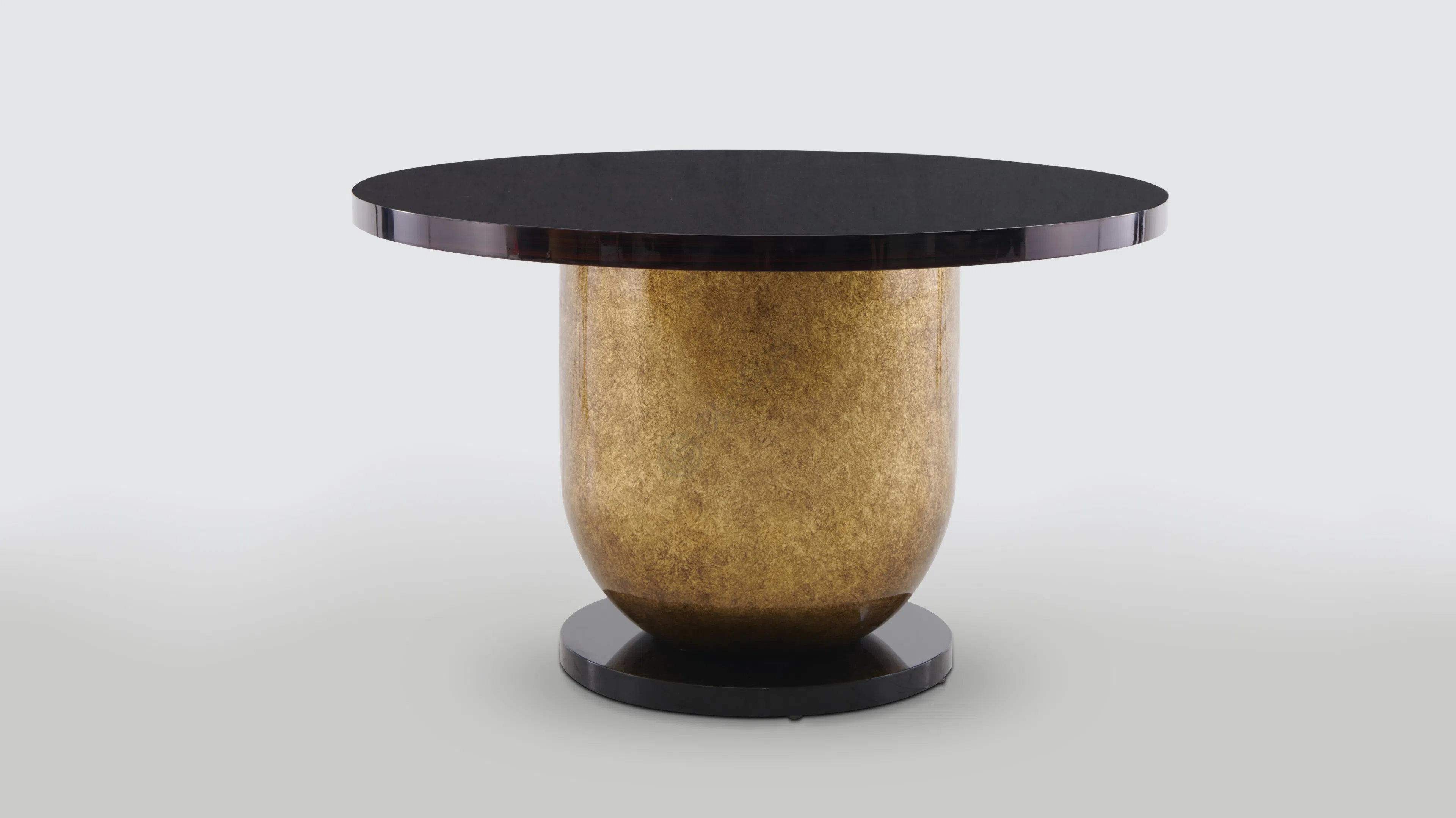 Основание столика представляет собой скульптурный элемент, изготовленный из натурального дерева или фанеры и покрытый отделкой, имитирующей драгоценный металл, который контрастирует с темными поверхностями столешницы и нижнего диска. Этот диск также выполнен из натурального мрамора или шпона, обеспечивая устойчивость и завершая гармоничный образ предмета. Каждая деталь столика продумана для создания впечатления легкости и элегантности, делая его не просто предметом мебели, но и произведением современного искусства.