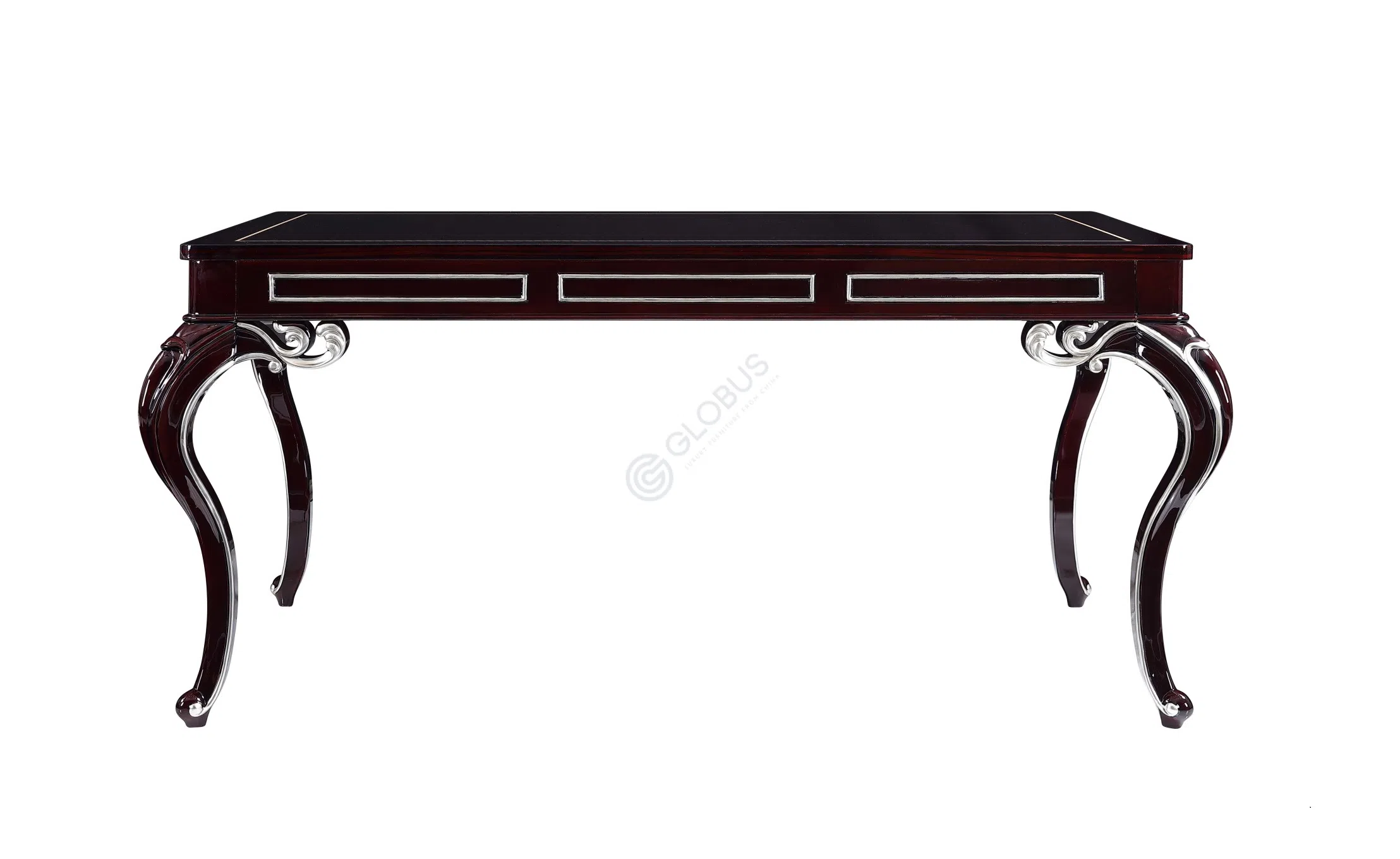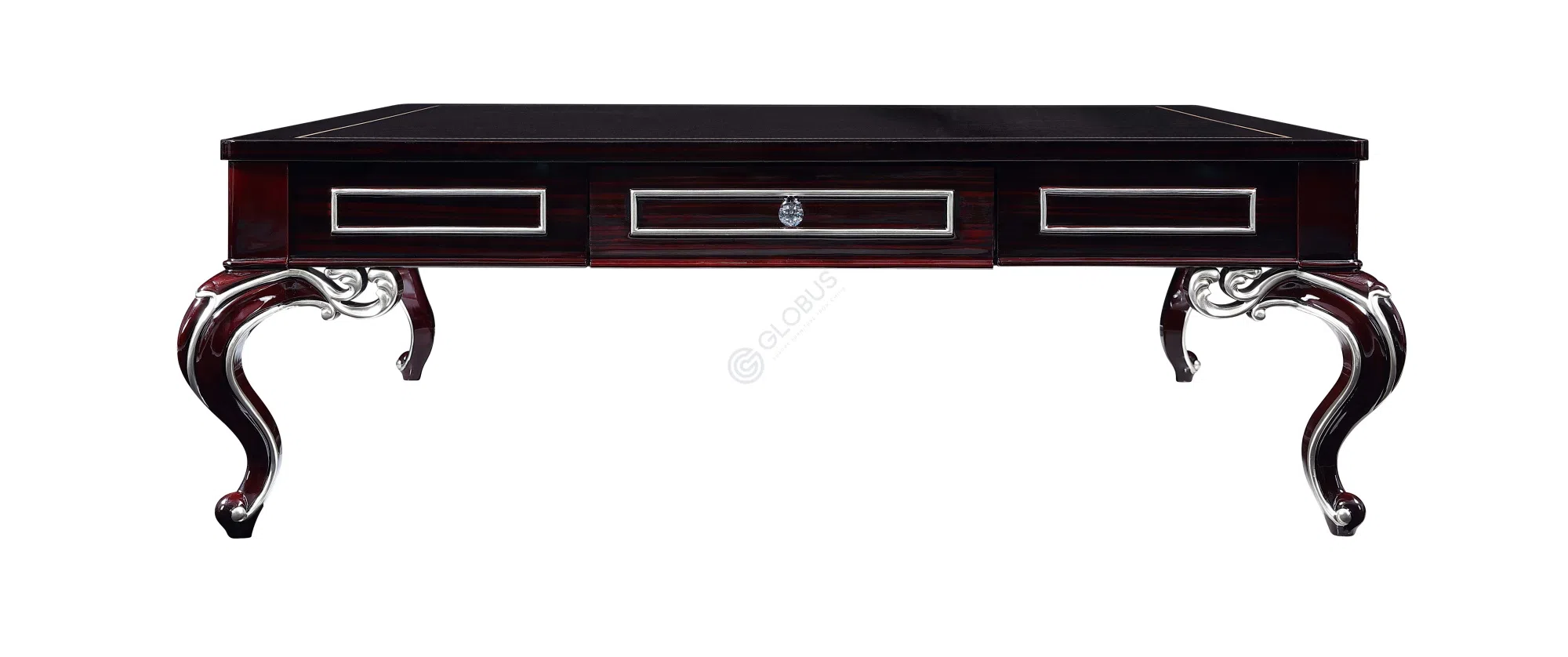 Плавные изгибы ножек являются характерной чертой классического стиля. Темная, почти зеркальная отделка столешницы контрастирует с деликатными серебристыми элементами и фурнитурой, создавая эффект благородной сдержанности. Удобные выдвижные ящики добавляют функциональности.
