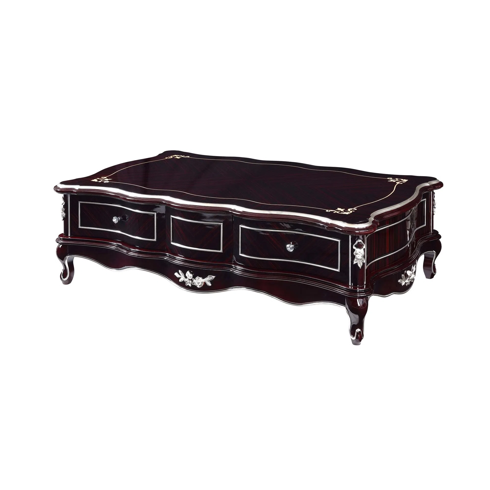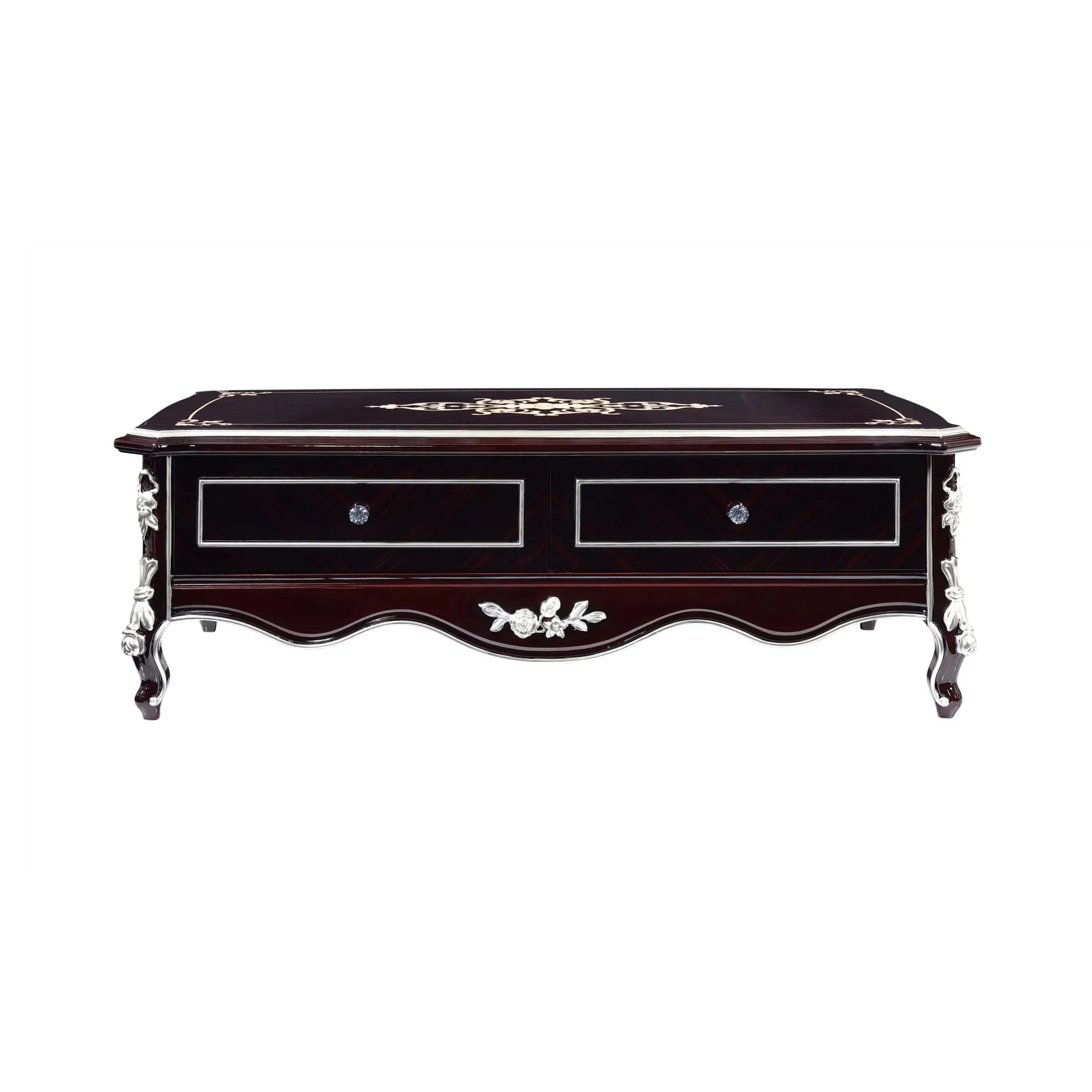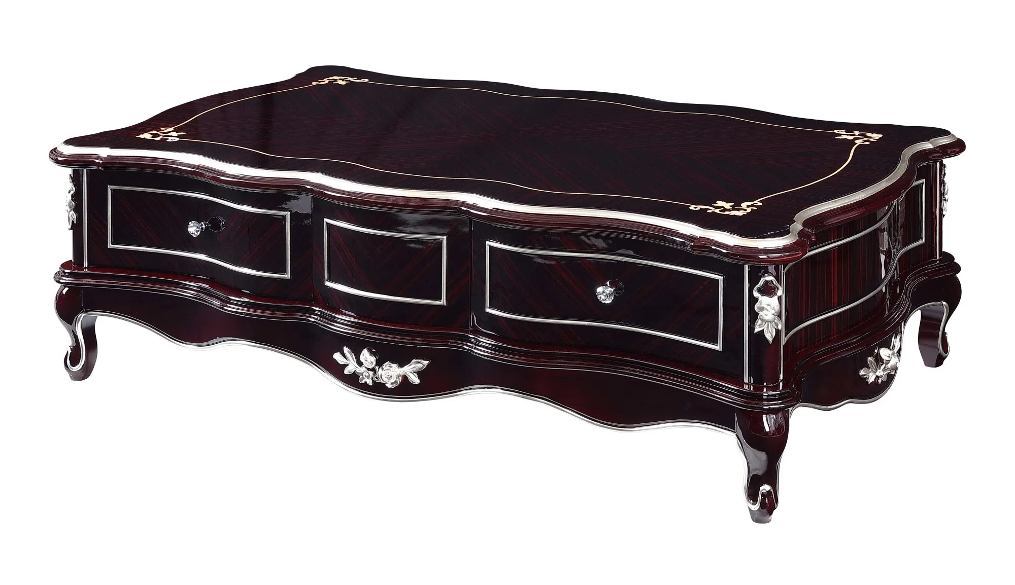 Дизайн отличают плавные линии и утонченные декоративные элементы. Фигурные ножки и резная планка по низу создают ощущение легкости, несмотря на монументальность формы. Деликатная отделка кантов и фурнитуры добавляет роскоши, гармонично сочетаясь с глубоким оттенком поверхности. Функциональность предмета представлена вместительными отделениями и выдвижными ящиками для удобного хранения.