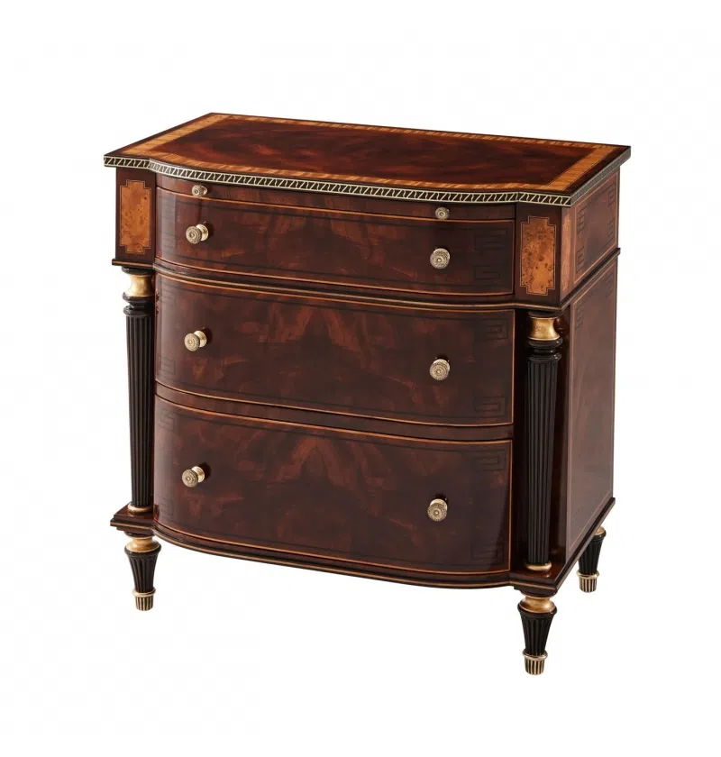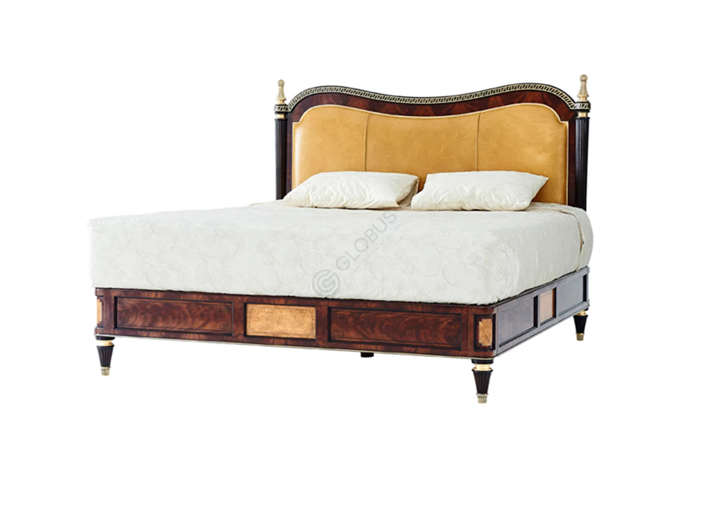 Поверхность столешницы выполнена из натурального дерева и покрыта искусно подобранным шпоном, демонстрируя богатую текстуру древесины. Аккуратные инкрустации и окантовка подчеркивают благородный контур. Четыре резные ножки, украшенные медными деталями, обеспечивают устойчивость и добавляют изделию особый шарм.