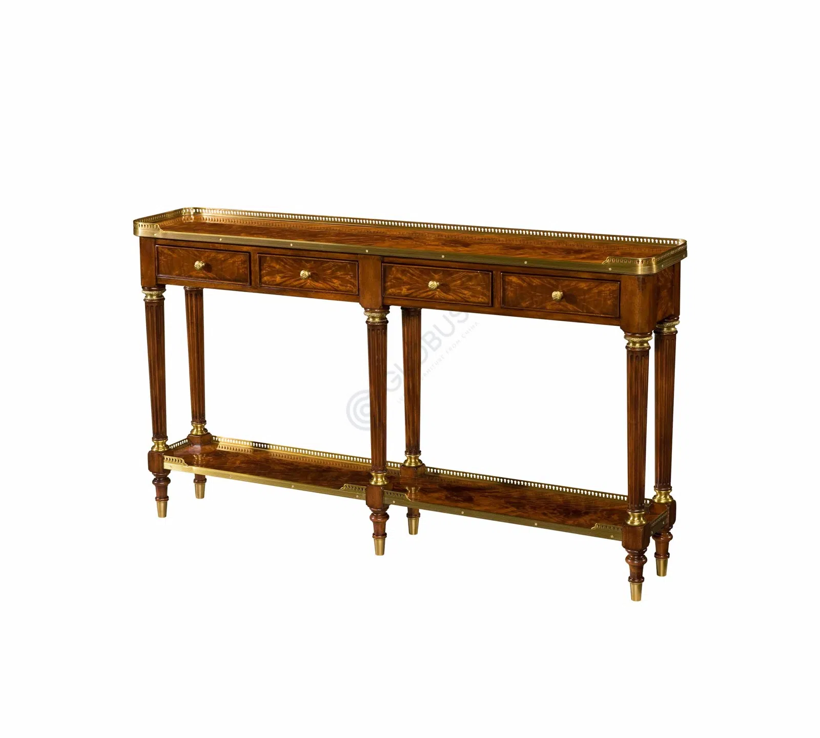 Дизайн консоли включает три выдвижных ящика, украшенных деликатной фурнитурой, предлагая удобное место для хранения мелочей. Стройные опоры, декорированные тонкими вертикальными линиями, завершаются изящными наконечниками, добавляя визуальной легкости. Нижний ярус не только усиливает устойчивость, но и предоставляет дополнительную поверхность для декора или нужных предметов.