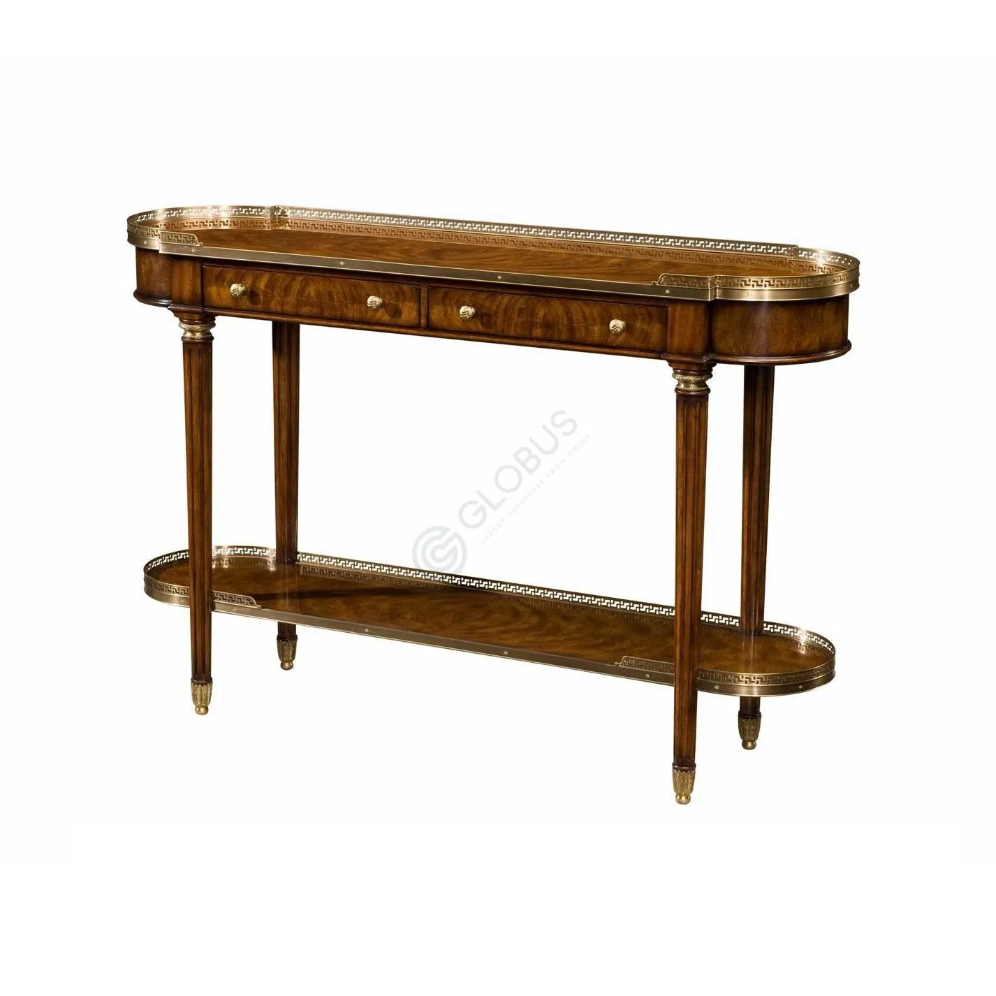 Дизайн стола продуман до мелочей: стройные ножки, напоминающие каннелированные колонны, придают ему легкость, а четыре выдвижных ящика обеспечивают удобное хранение. Функциональность расширяет нижняя полка. Декоративная медная кромка с изысканной чеканкой эффектно обрамляет столешницу и дополнительную плоскость, становясь выразительным элементом декора.