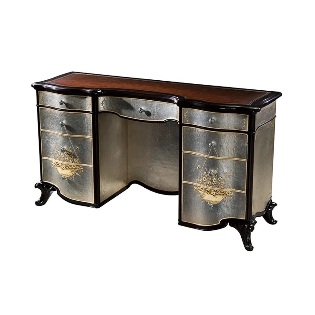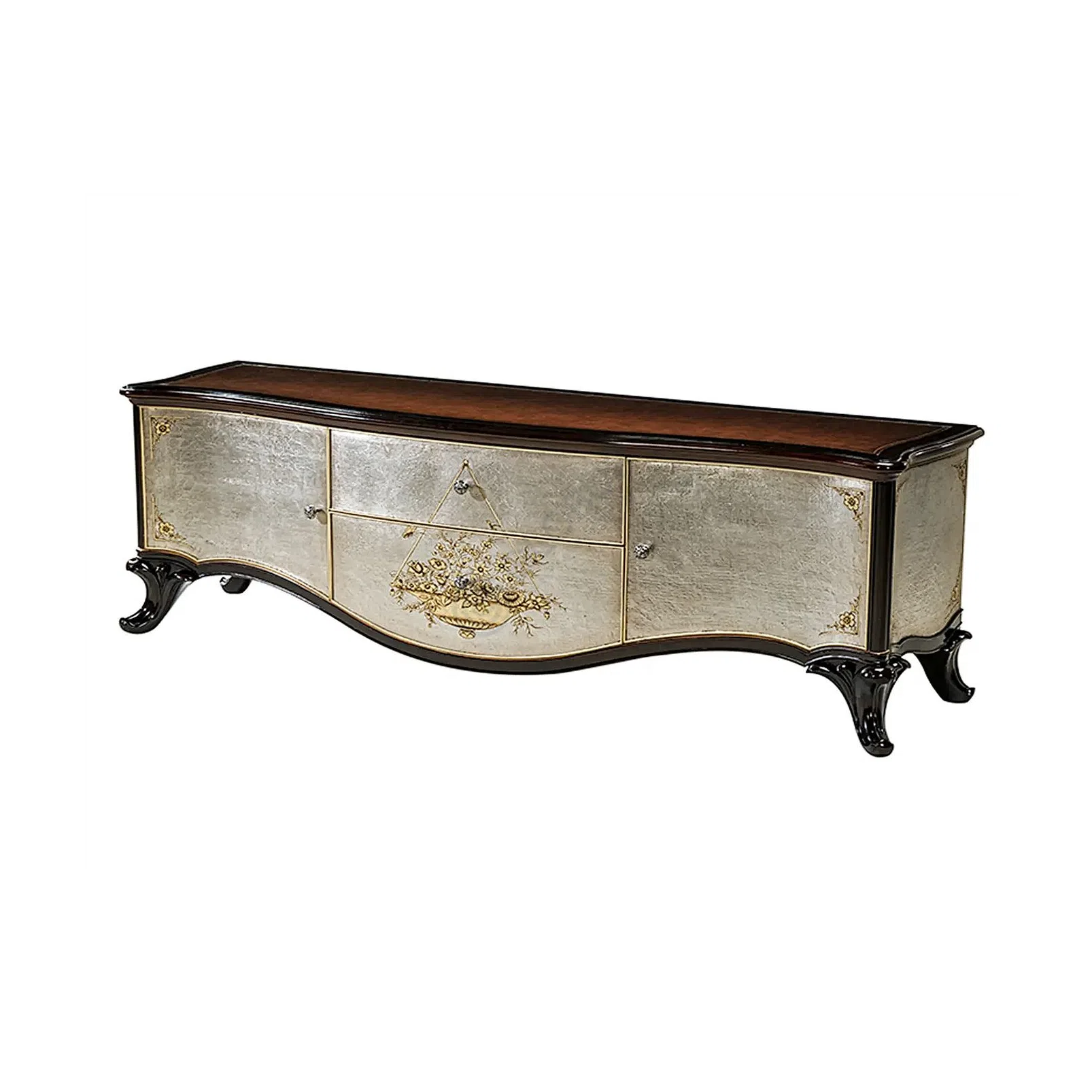Особое внимание уделено отделке фасада. Поверхность обработана с использованием патины, что придает ей благородный винтажный вид и изысканный серебристый оттенок. Декоративные элементы, тонко нанесенные или вырезанные, подчеркивают изогнутые формы ящиков, добавляя визуальную глубину и роскошь.