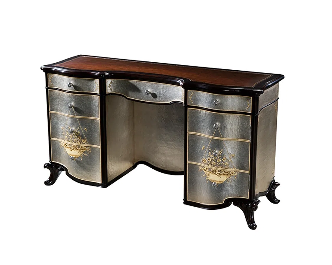 Поверхность изделия оживает благодаря мастерски выполненным золотым росписям. Эти детальные декоративные панно изображают живописные восточные сюжеты, добавляя в классический дизайн нотки экзотики и роскоши. Сочетание приглушенного серебра и яркого золота создает эффектный контраст, притягивающий взгляд.