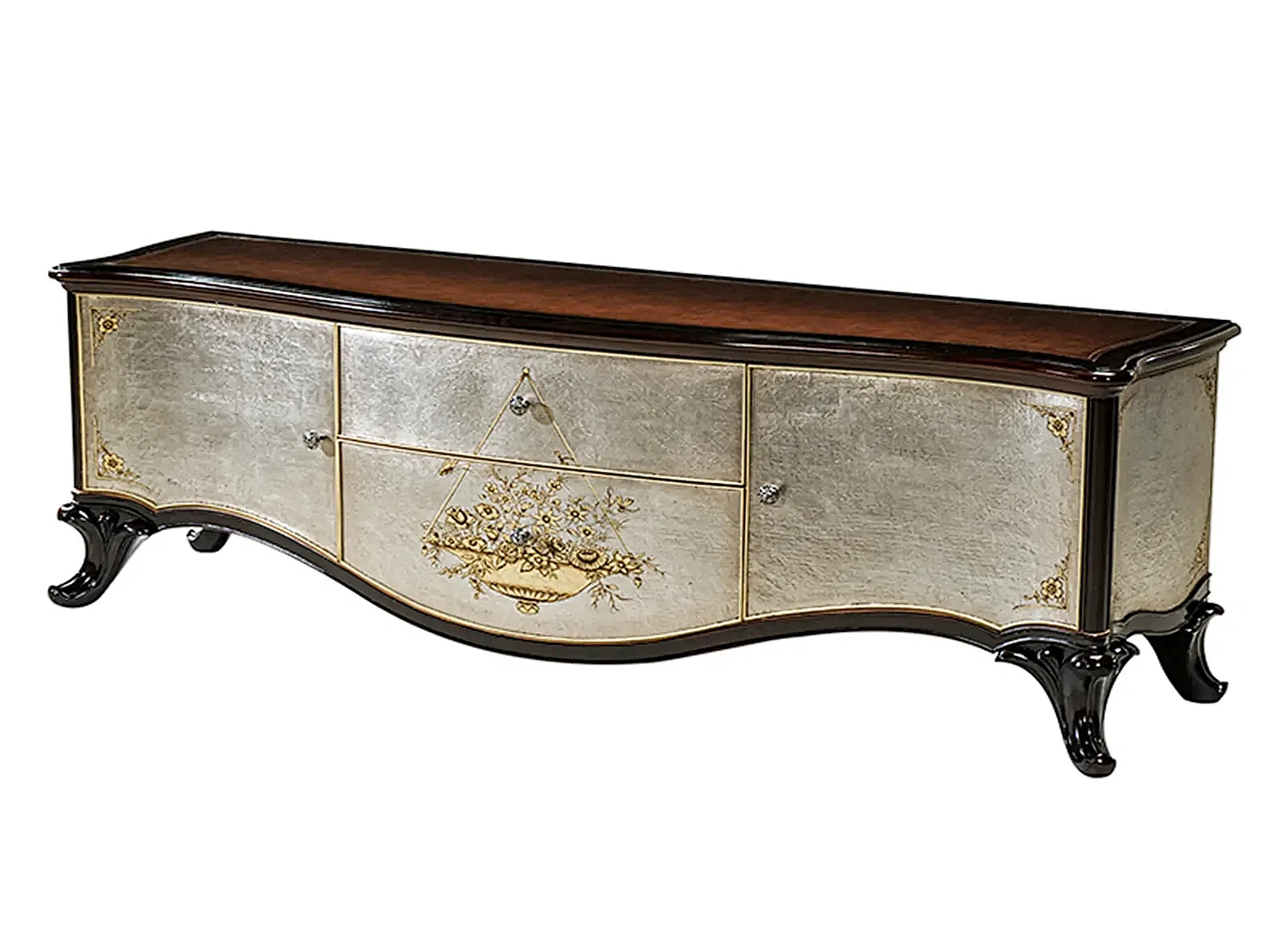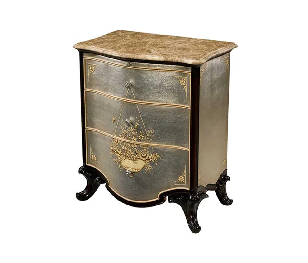 Этот элегантный шкаф представляет собой изысканное сочетание классических форм и утонченного декора. Его силуэт гармоничен, а фигурные ножки придают облику легкость и особый шарм, свойственный европейской классике. Фасад и боковины украшены уникальным покрытием, имитирующим благородную патину состаренного серебра, что придает предмету антикварный вид и глубину.