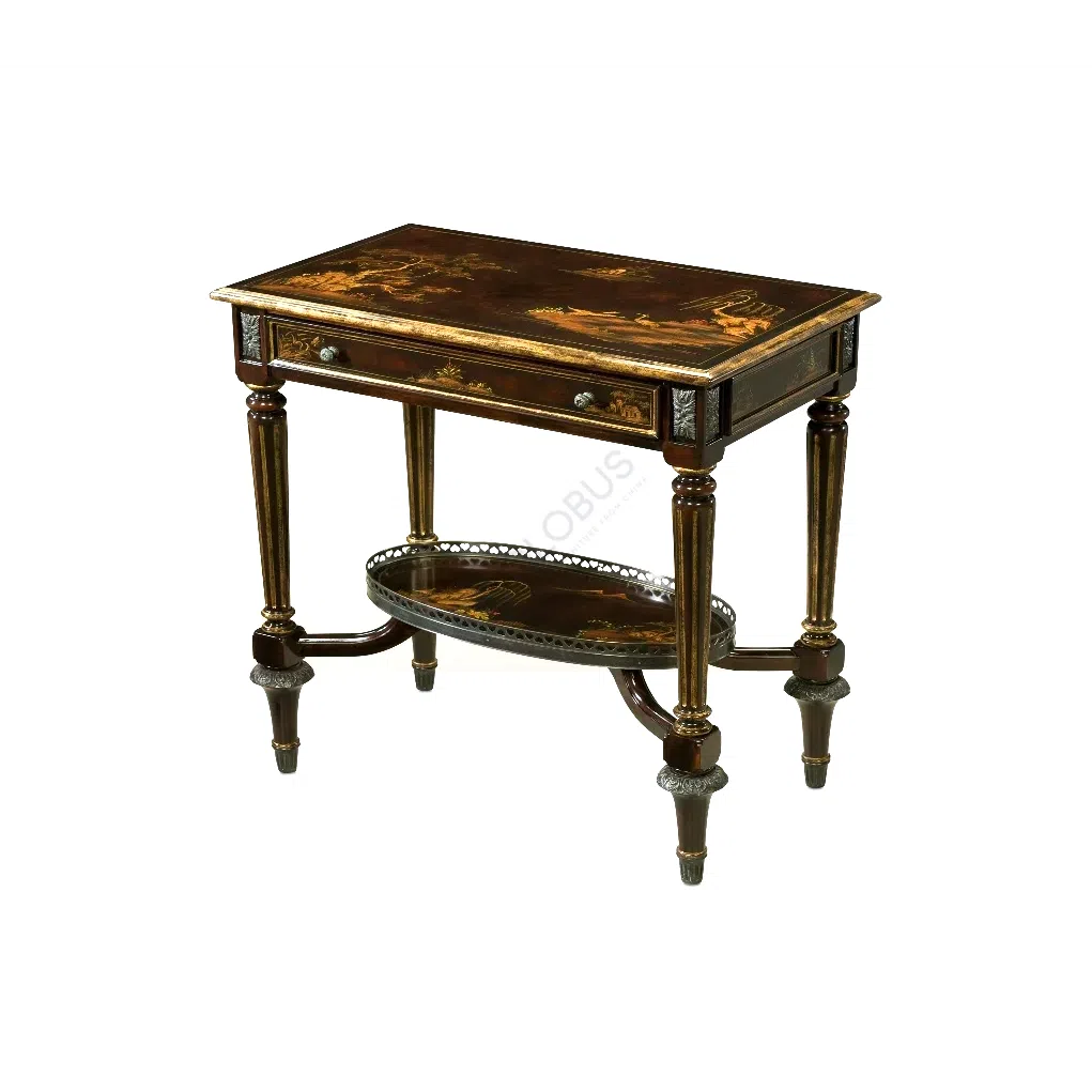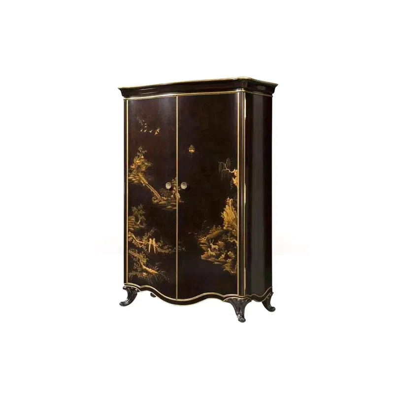 Изящные изогнутые ножки, выполненные в стиле европейской классики, декорированы тонкой резьбой, подчеркивающей их элегантную форму. Особенностью модели является фигурная спинка, несущая на своей глянцевой черной поверхности живописное изображение в восточном стиле – детализированный пейзаж с элементами архитектуры и природы, выполненный в оттенках золота и бронзы.