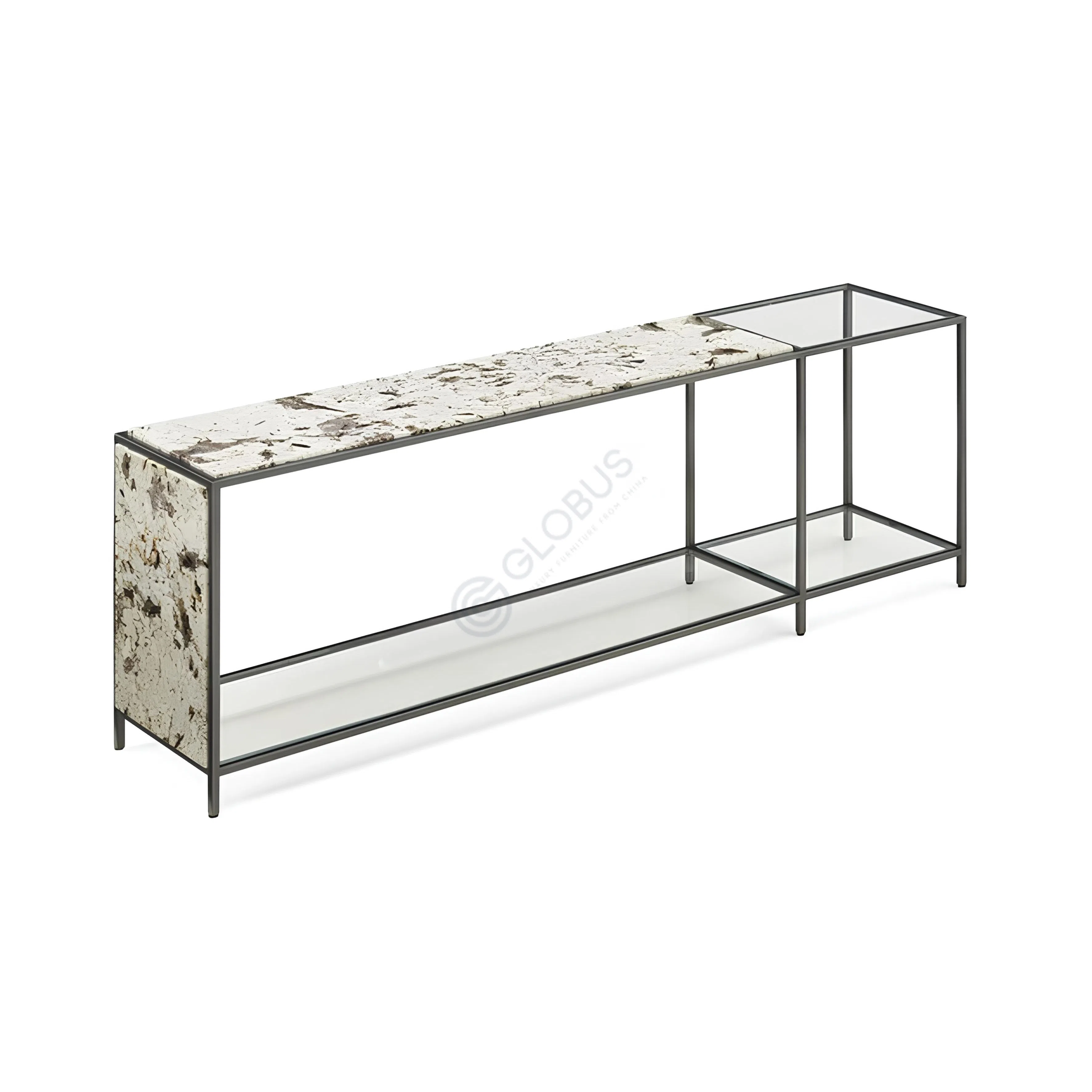 Второй уровень конструкции представляет собой полку из искусственного мрамора. Ее уникальный рисунок добавляет визуальный интерес и роскошную текстуру, создавая контраст с прозрачностью стекла и строгостью стального каркаса. Это гармоничное сочетание различных фактур и оттенков делает предмет мебели не только удобным местом для размещения предметов, но и значимым акцентом в интерьере.